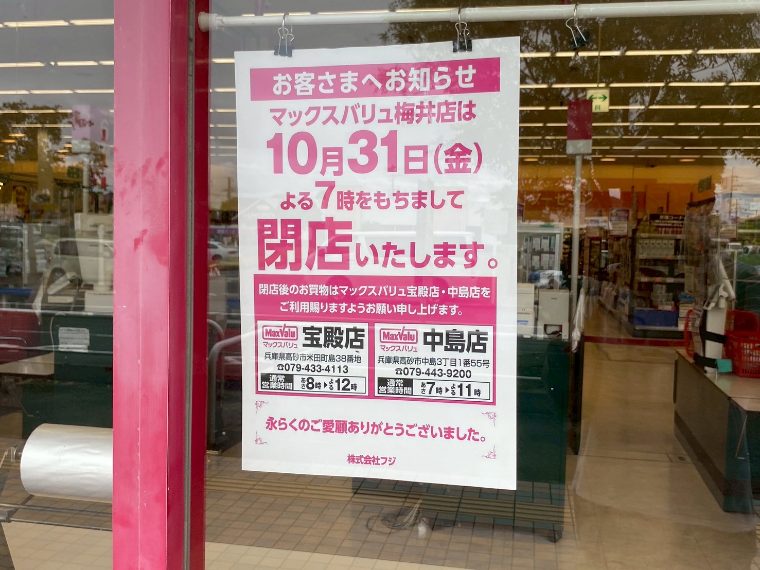 「マックスバリュ梅井店 10月31日をもって閉店」といったお知らせが掲示されていました。ググってみたところ、イオンタウン高砂公式HPにも同様のお知らせがありました。