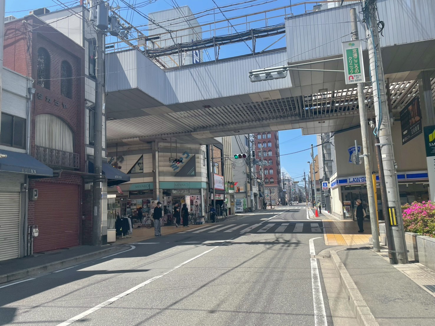 反対側にはみゆき通り商店街のアーケード。ミヤコレコード、ローソン姫路呉服町店が見えます。