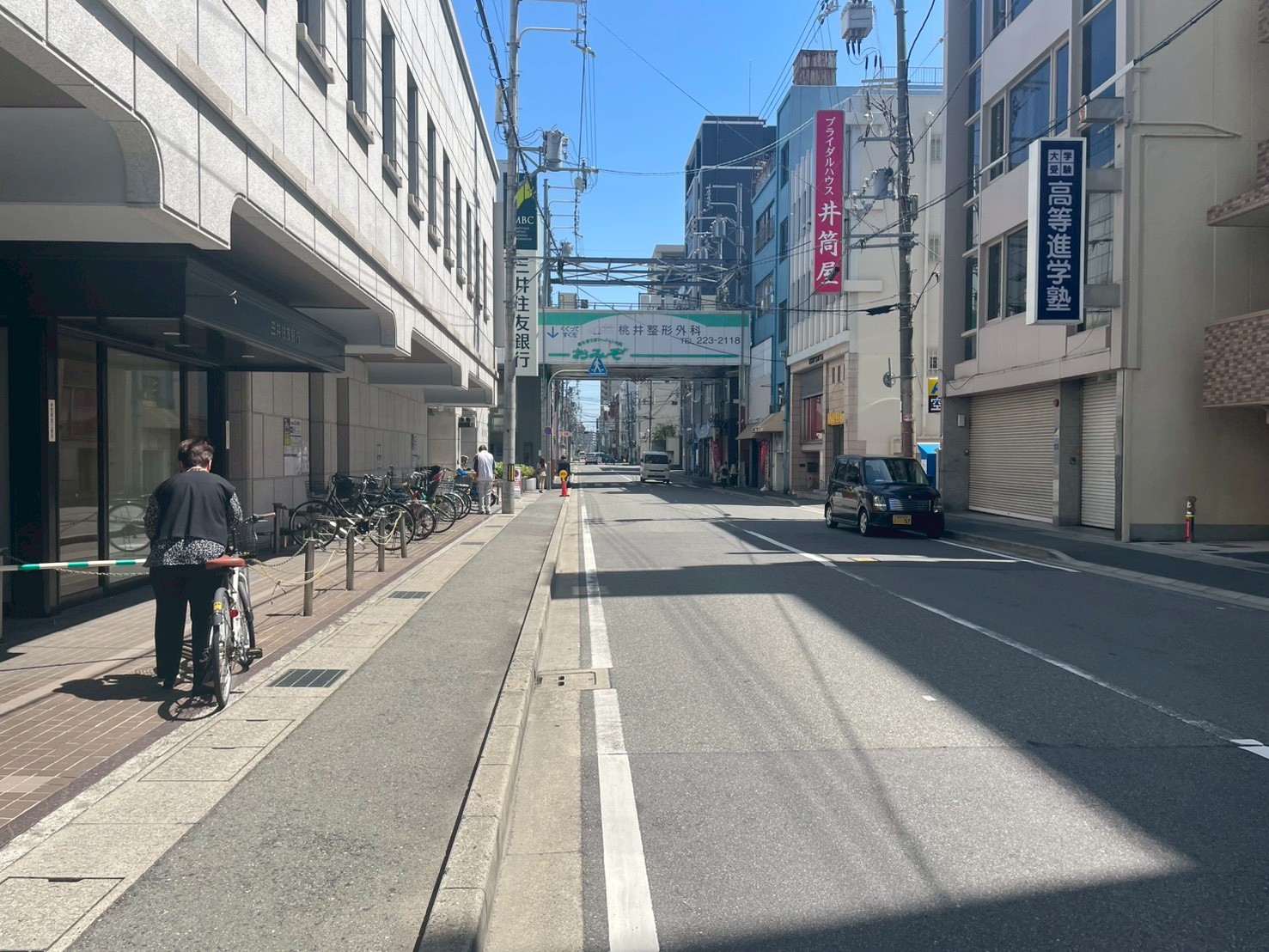 小溝筋商店街のアーケードが見えます。