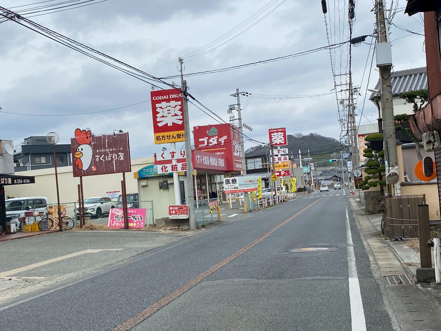 反対側には、まくばり屋、ゴダイ薬局大塩店。