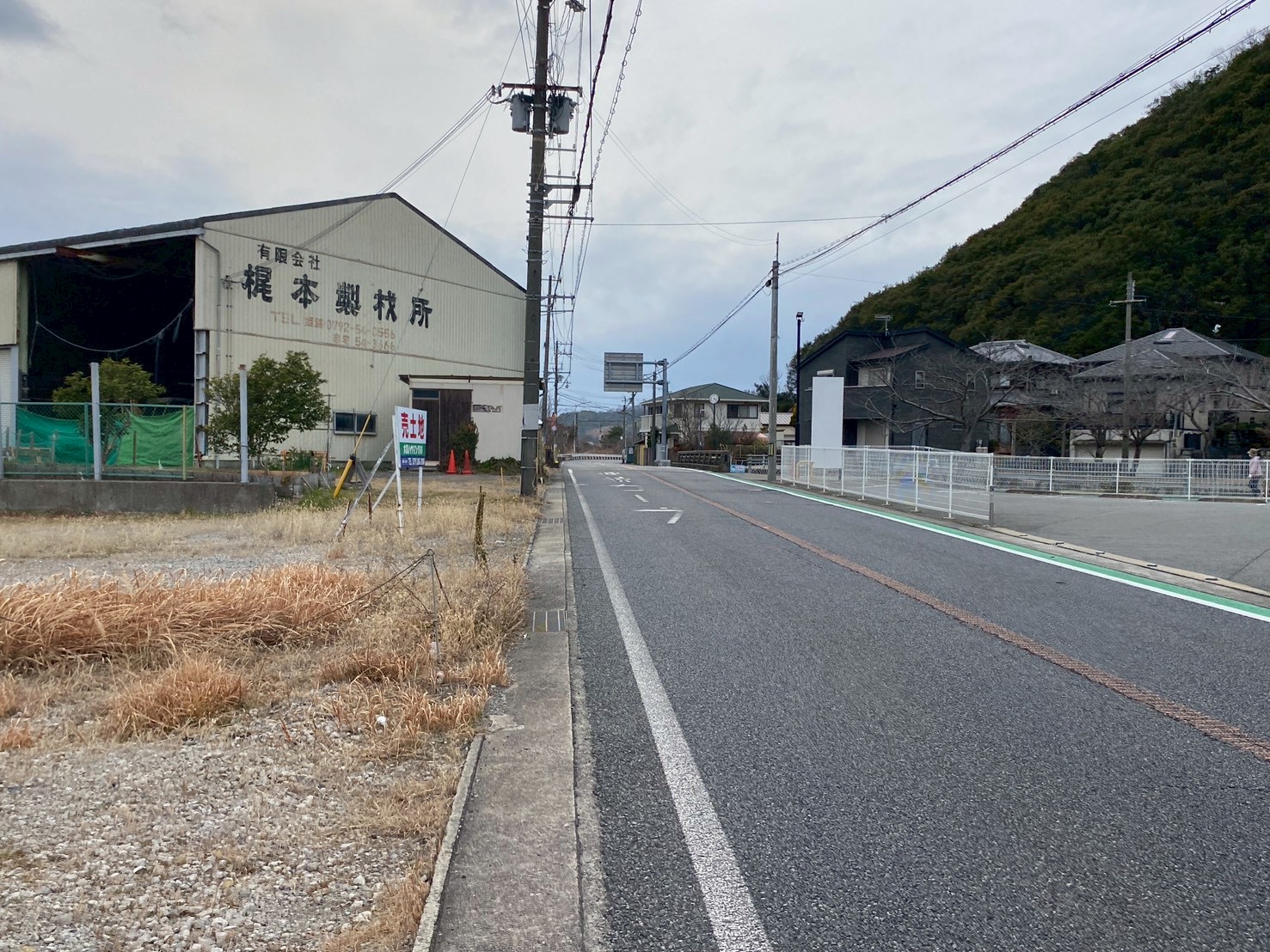 国道250号線(ハマコク)沿い。ななめ向かいに、(有)梶本製材所。