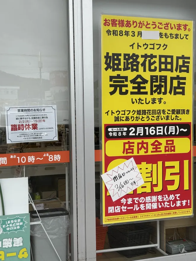 花田のラ・ムー横にある『イトウゴフク』が閉店告知してました。3月に閉店とのこと。2/16(月)からセールみたいです。画像左にもありますが、臨時休業がありますのでご注意を。
