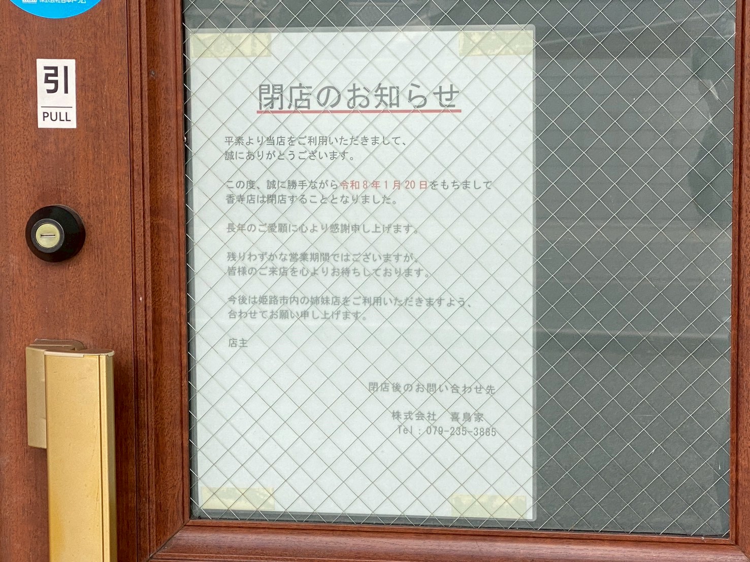 以前記事にも書いた『喜鳥家香寺店』が、2026年1月20日をもって閉店するみたいです。場所は312号線沿い、名城酒造のすぐ北側。