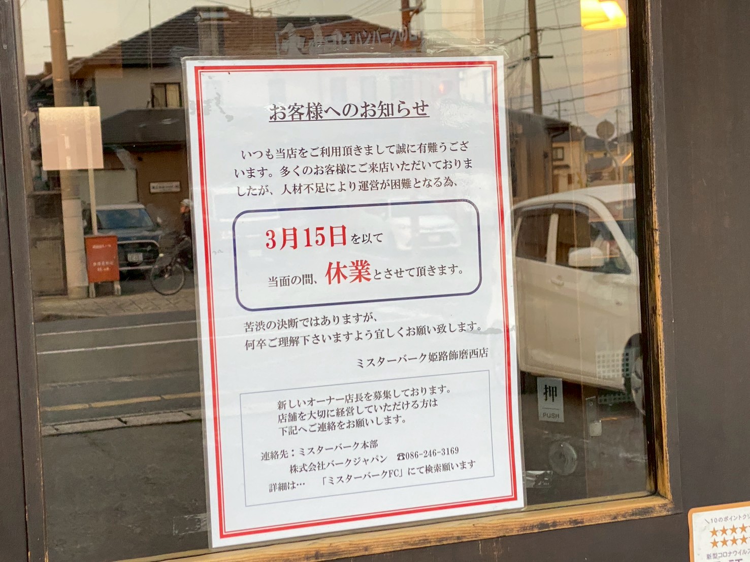 以前記事にも書いた、『ミスター・バーク姫路飾磨西店』が、2026年3月15日をもって休業するみたいです。”アメリカンステーキハウス”ということで、ハンバーグやステーキなどがリーズナブルに楽しめて、ご飯おかわり自由などのシステムも人気のお店。掲示物によると、人手不足により当面の間休業されるそうです。