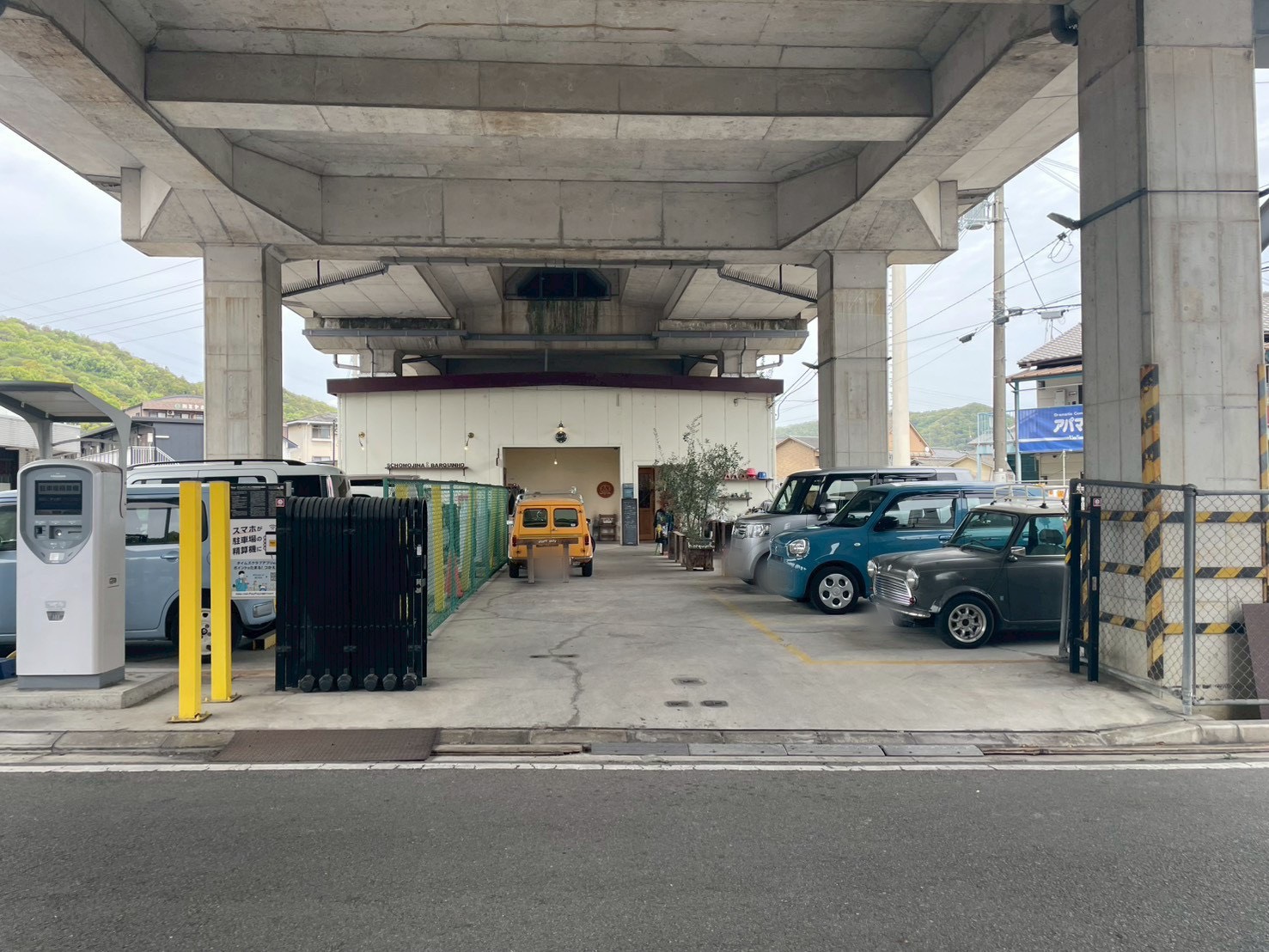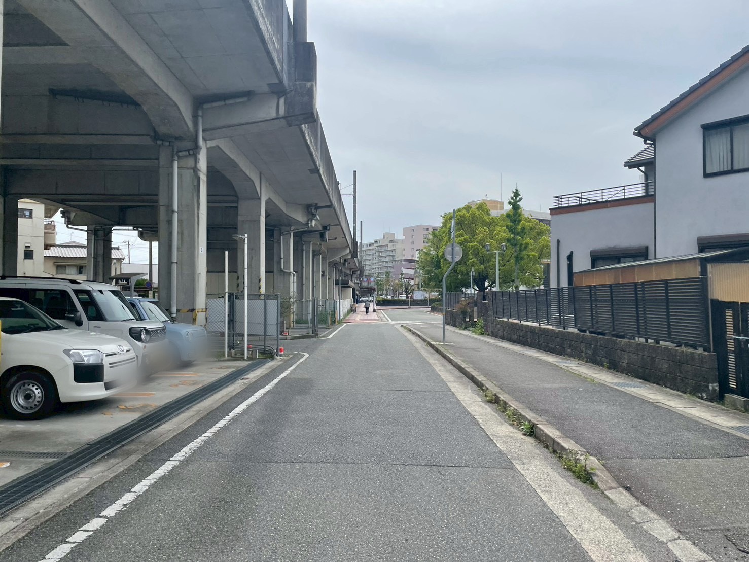 タイムズの駐車場が並ぶ高架沿いの道路を挟んで、居酒屋おいで家、炭火焼き鳥一福、ちょい飲み屋Uruとテナントが並んでいます。