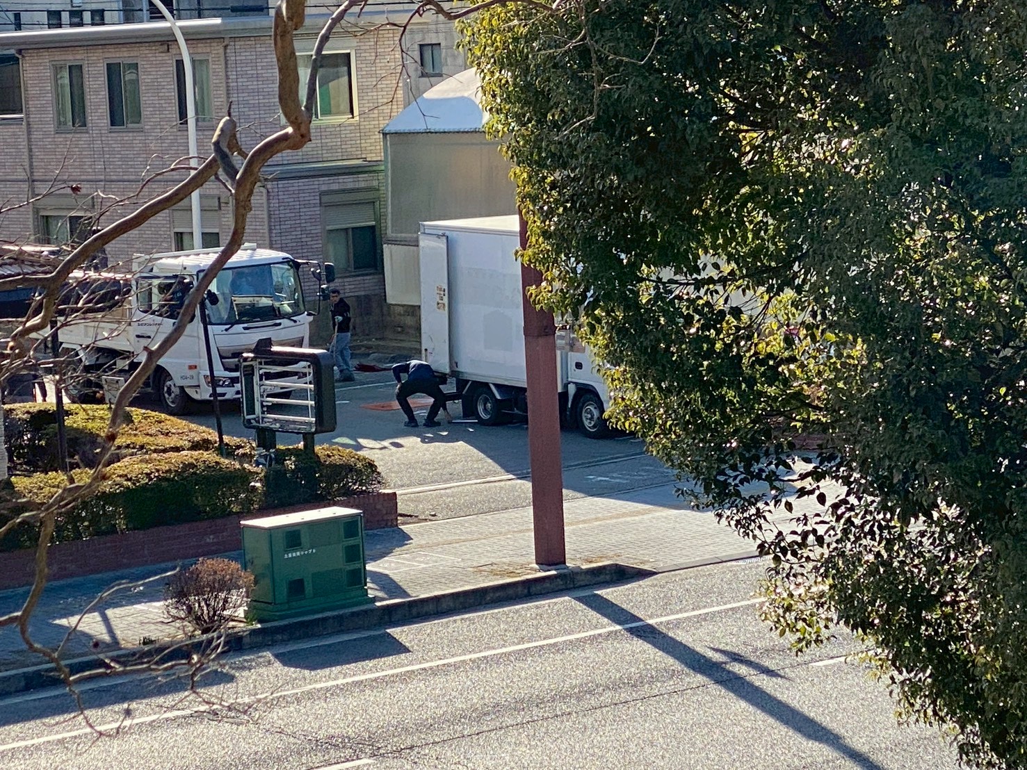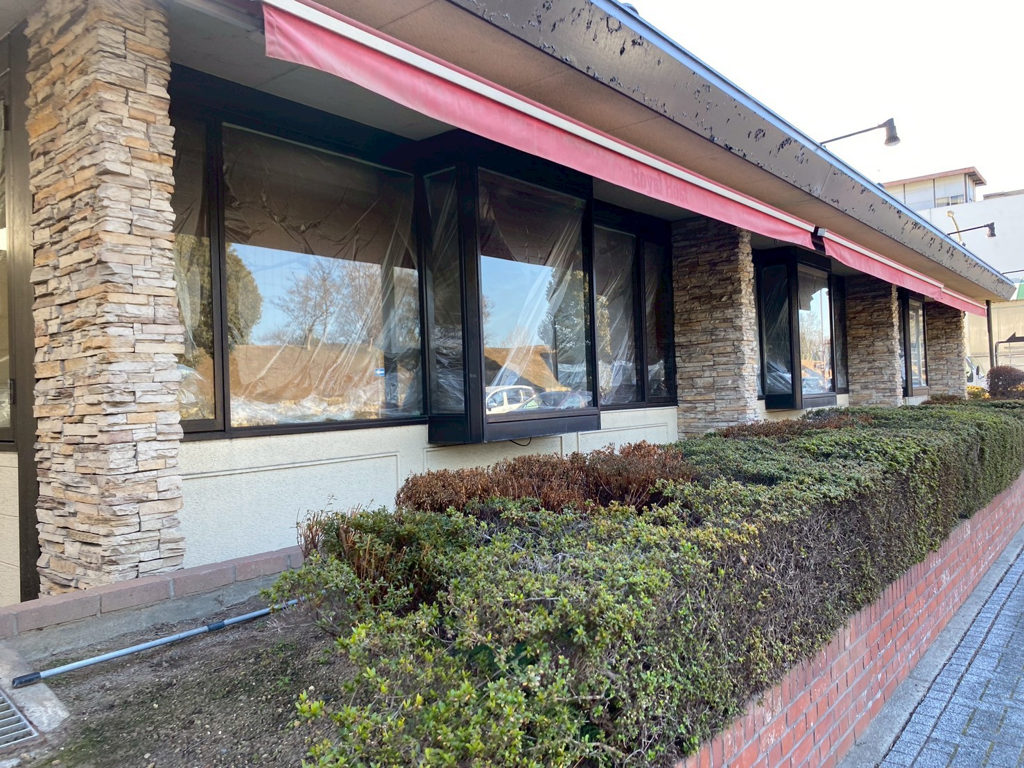 店内はすでに窓がビニールで覆われており、外観の看板「Royal Host」も作業員さんが取り外しにかかっていました。大型トラックも停まり、備品などの搬出も始まっているようです。