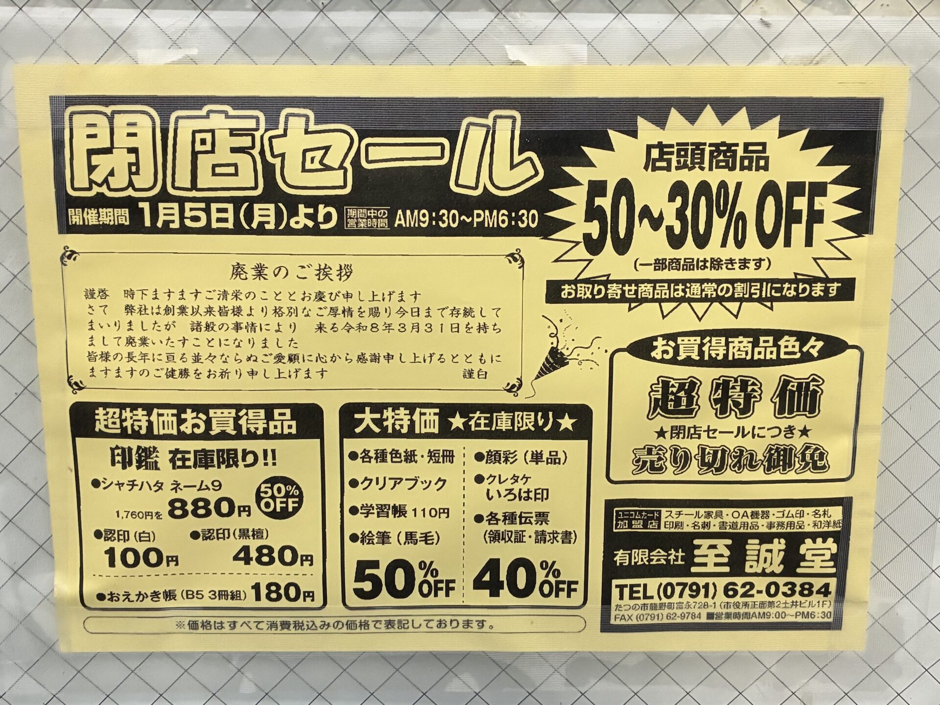 たつの市役所前の老舗文具屋『至誠堂』 が閉店するみたい!閉店セールやってる