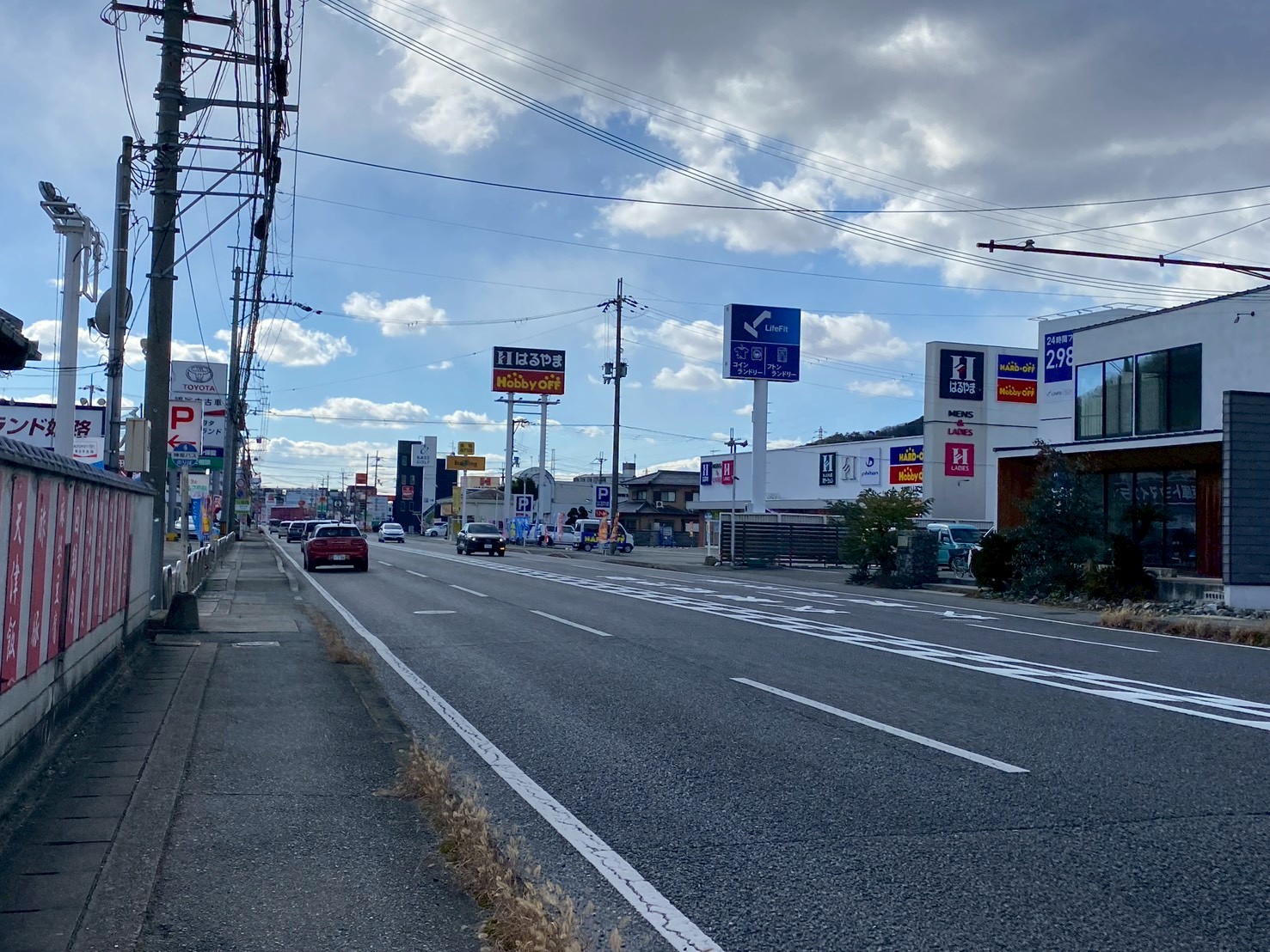 312号線沿い、はるやま姫路北店やハードオフ・ホビーオフ姫路砥堀店の看板が見えます。