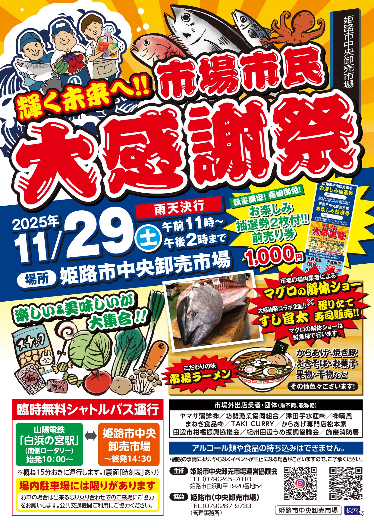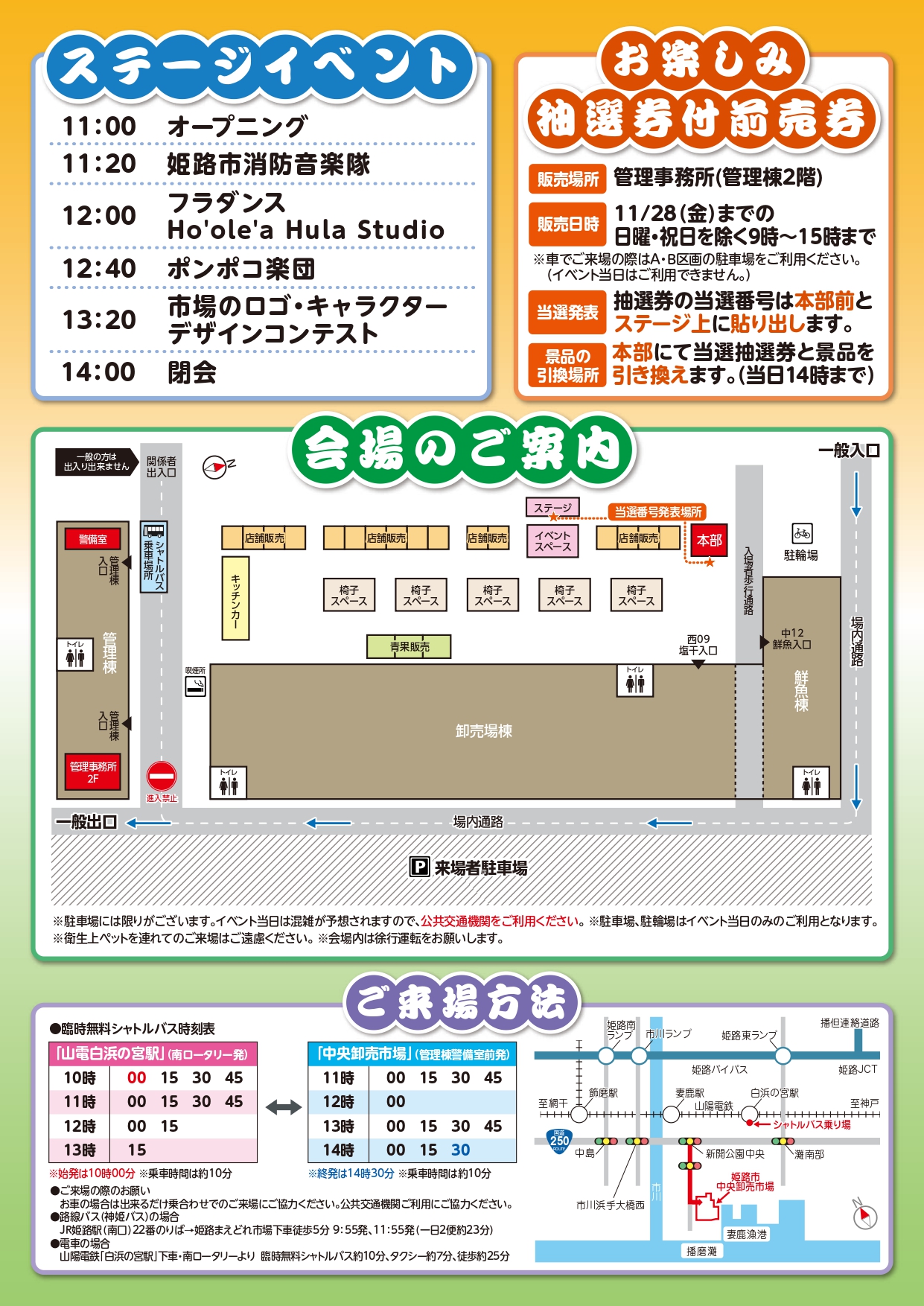 当日、お買い物や飲食コーナーなどで利用できる前売り券(100円券10枚綴り+抽選券2枚)を1冊1,000円で、姫路市中央卸売市場 管理棟2階東側 管理事務所で販売。前売り券の購入は現金のみ、とのことです。