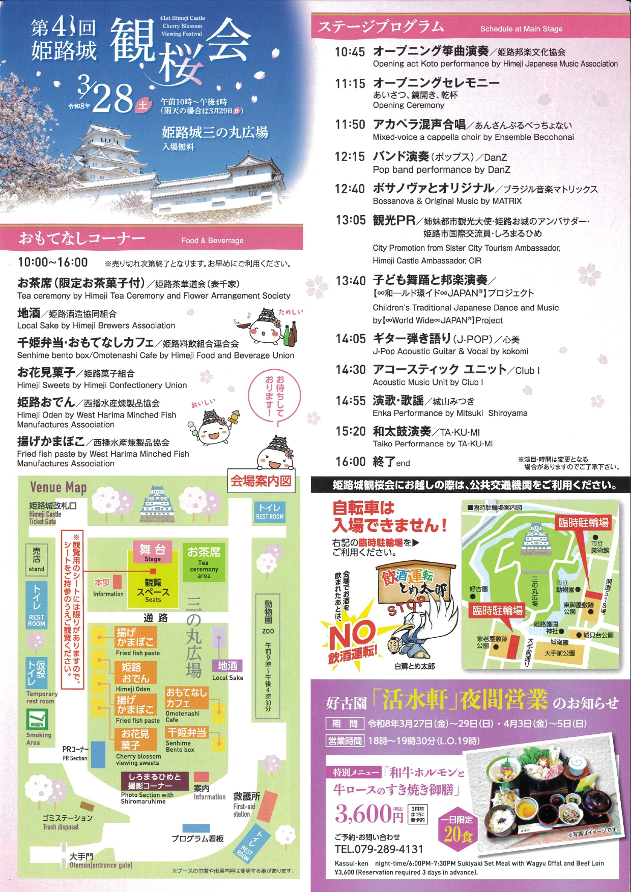公式HPによると、2026年3月28日(土) 姫路城三の丸広場にて、『第41回 姫路城観桜会』が開催されるみたいです。お茶席をはじめ、おもてなしコーナーでは地酒やお花見弁当、お花見菓子などの飲食物も販売されます。
