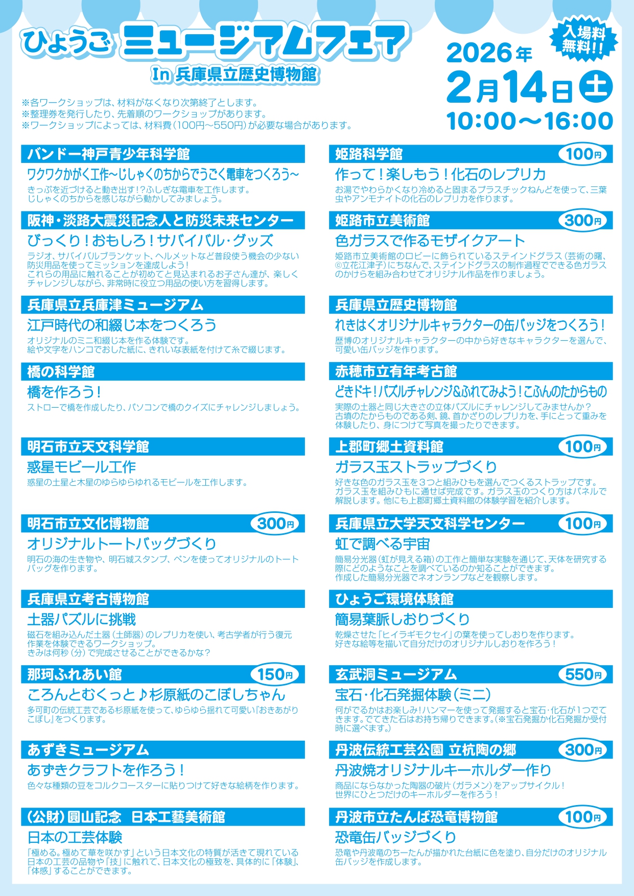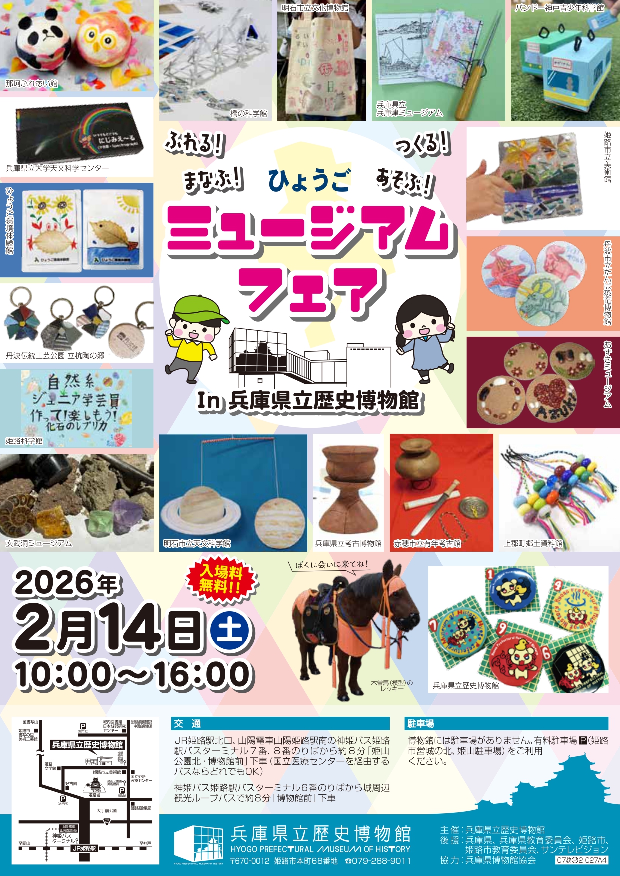 2026年2月14日(土)、兵庫県立歴史博物館にて『ひょうごミュージアムフェア』が開催されるみたいです。公式HPによると、「兵庫県内の博物館、科学館、資料館など20施設が集結し、さわって学べる体験コーナーや親子向けのものづくりワークショップなどの博物館のPRイベントを実施します。」とのこと。