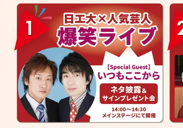 ステージイベントでは、14時よりお笑い芸人の いつもここからさんの爆笑ライブが予定されています。ネタ披露とサインプレゼント会も行われるそう。