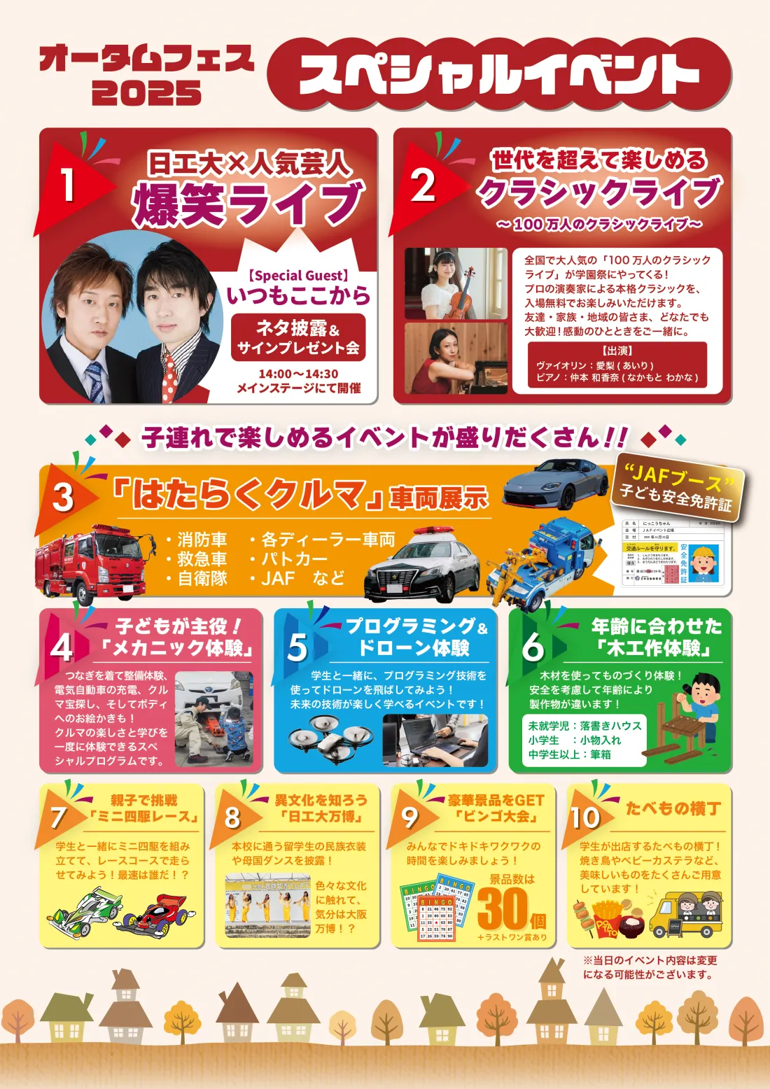 公式HPによると「今年の日本工科大学校オータムフェスは学園祭にパワーアップして盛大に開催されます!学生たちの情熱と地域の皆さまの笑顔が集まる、年に一度のお祭り。子どもから大人まで楽しめる多彩なイベントが勢ぞろいです。」とのことで、内容は↓