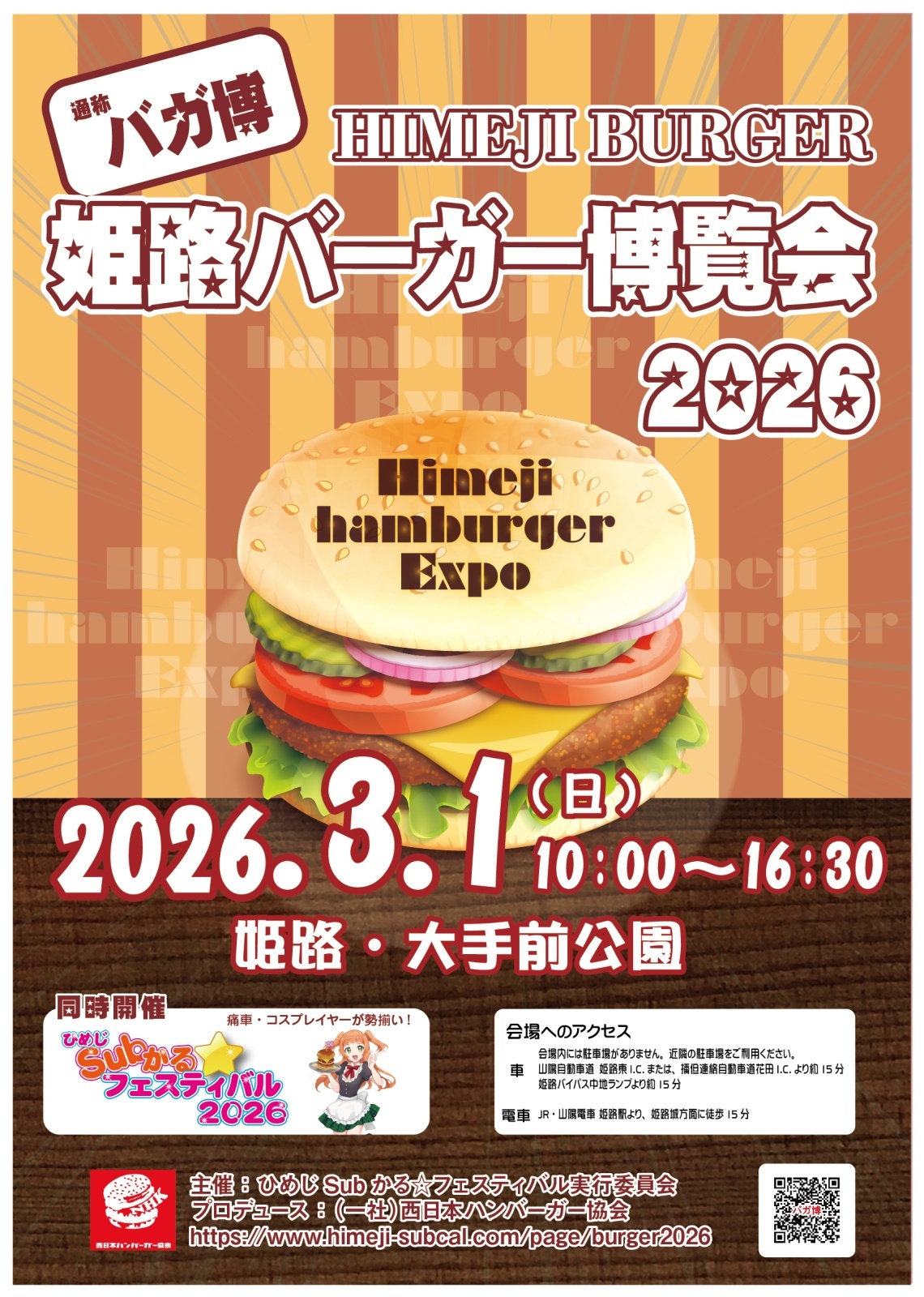今年も西日本ハンバーガー協会プロデュース『姫路バーガー博覧会(通称:バガ博)』が同時に開催されるよう。公式HPによると、ご当地バーガーや、グルメバーガーなどが楽しめるみたいです。