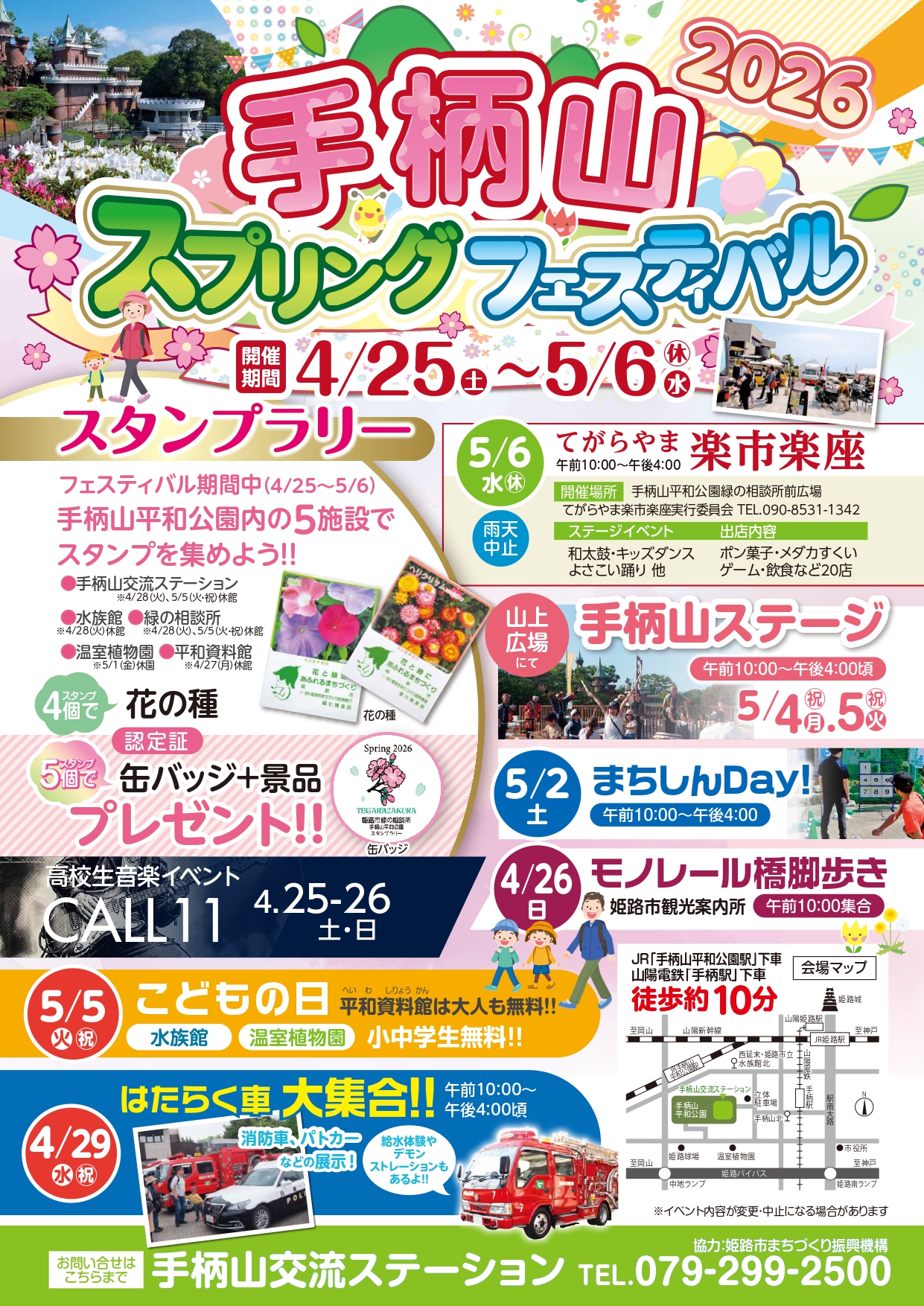 2026年4月25日(土)~5月6日(水祝)の12日間、手柄山交流ステーションや周辺施設で『手柄山スプリングフェスティバル』開催!期間中、山上広場では様々な催しが予定されています。↓
