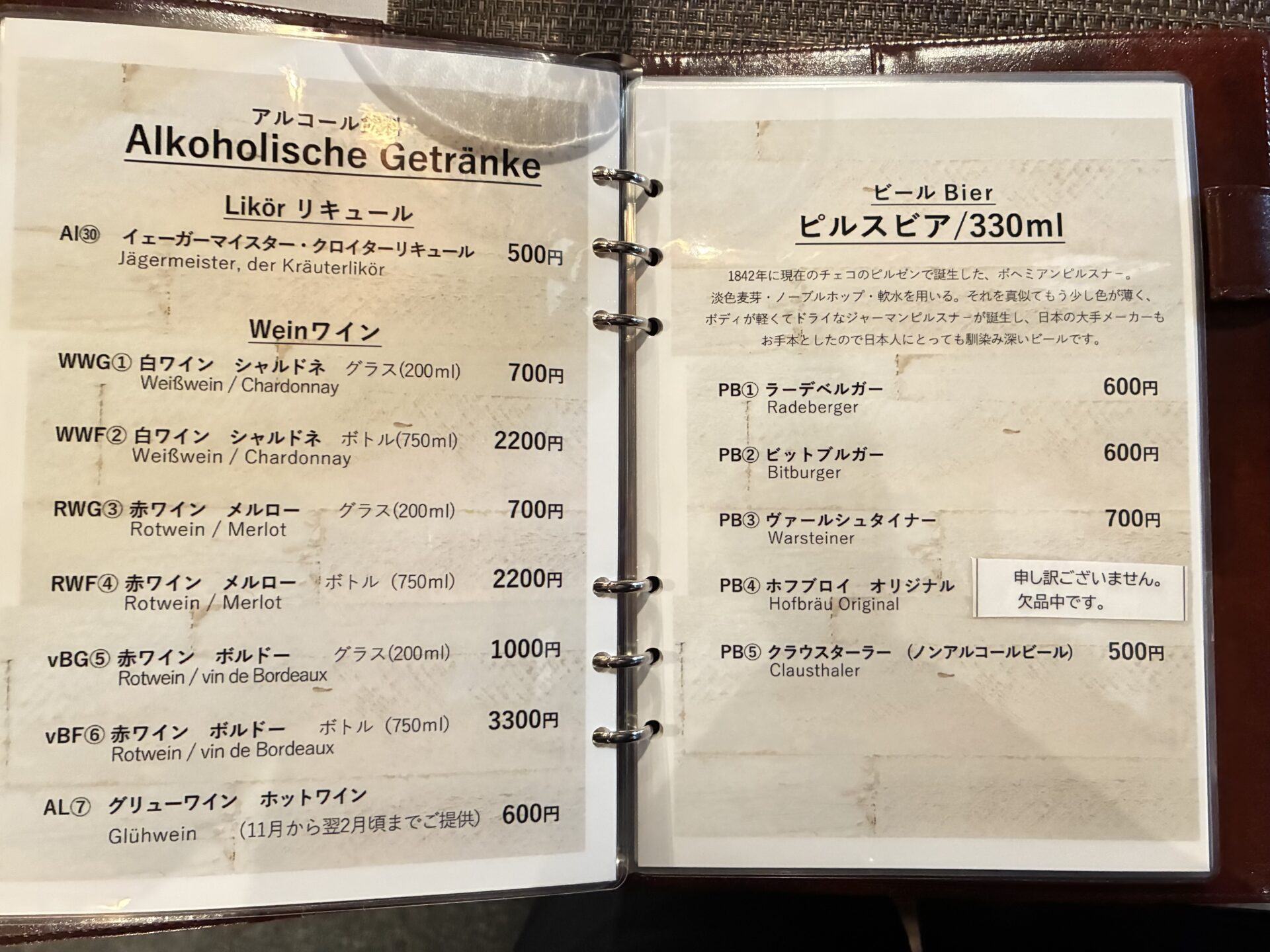 本格的なドイツ料理になじみがないのでドキドキしましたが、奥様が詳しく料理の説明をして下さったので安心して美味しくいただけました。今回は車だったので注文しなかったけれど、ドイツビールとかも充実してたような気がします。