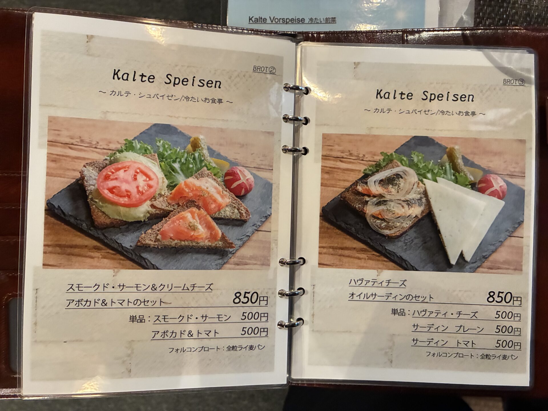 全粒ライ麦パンの4種のオードブルで、ドイツの一般的な夕食だそうです。少しずつ色んな種類が食べられて良かったです。全粒ライ麦パンはサクッとした感じで美味しかったです。