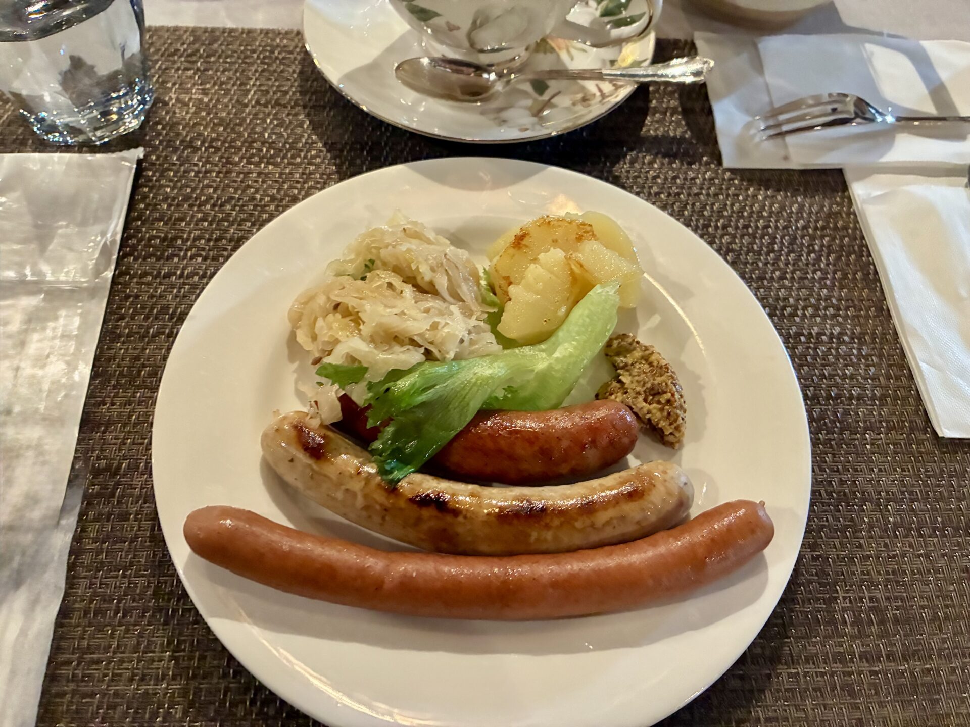 粗挽き、焼き、茹でのソーセージに、ザウアークラウト(キャベツの酢漬け)とじゃが芋のソテーが添えられていました。粗挽きソーセージはさすが本場!って感じでした。