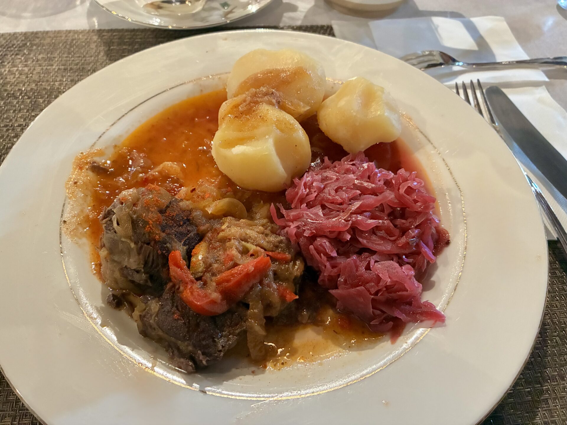 メイン料理は牛肉のグラーッシュ。赤キャベツとじゃが芋が添えられてました。グラーッシュはドイツの煮込み料理らしいです。お肉がびっくりするくらい柔らかくてホロホロで美味しかったです。