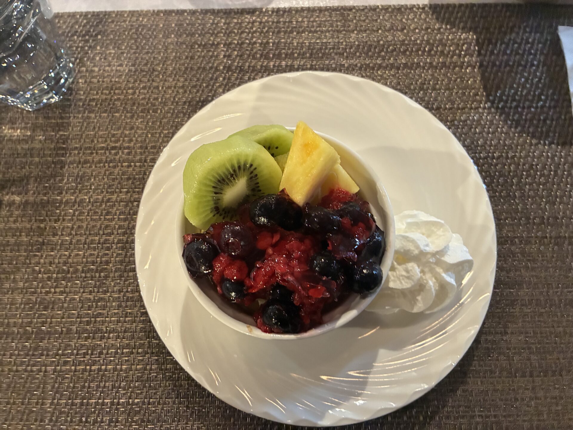 私が頼んだデザートはオブストボーデン!フルーツの下は、スポンジケーキとカスタードクリーム。程よい甘さで美味しかったです。