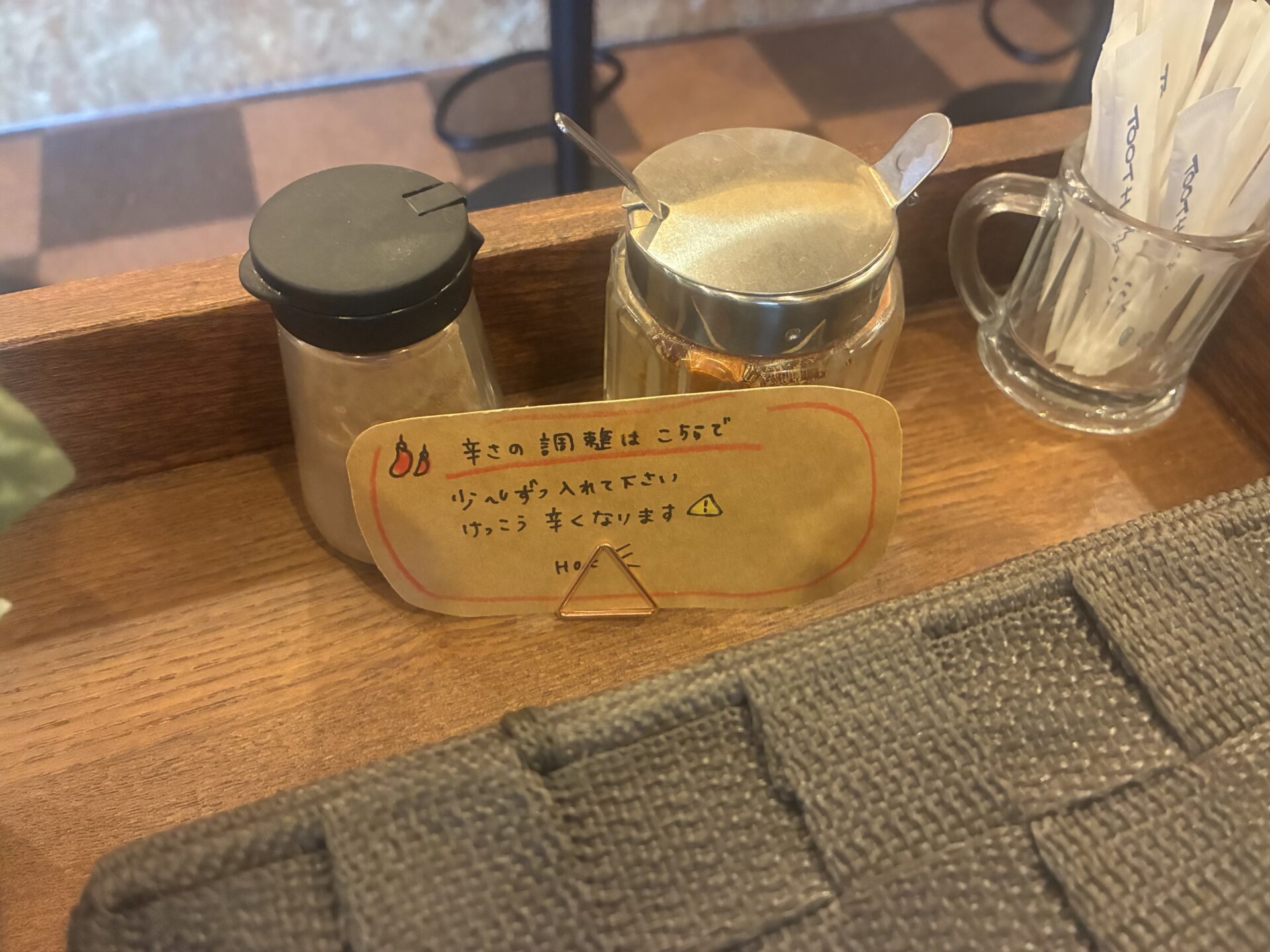 ベースのカレーは食べやすい辛さで、辛いのが好きな方は自分で香辛料をかけるようになっていました。友達によるとかなり辛いけど美味しい!とのことです。