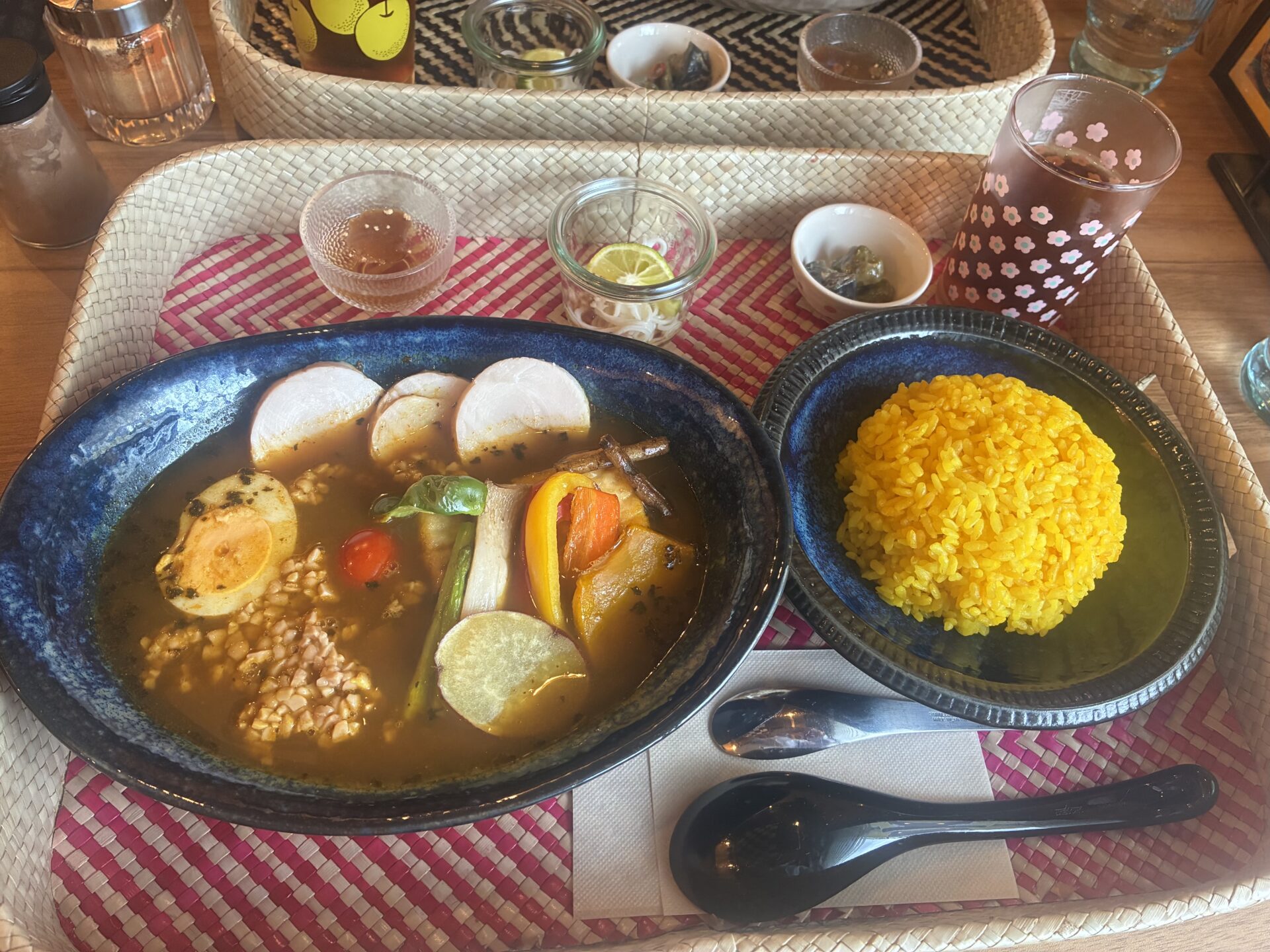 メインのスープカレーにサフランライス、箸休め的な小鉢がセットになっています。ちょっと見えにくいですが、小鉢は左からお茶のゼリー、一口素麺、茄子の美味しいのんでした。サフランライスも美味しかったです♪
