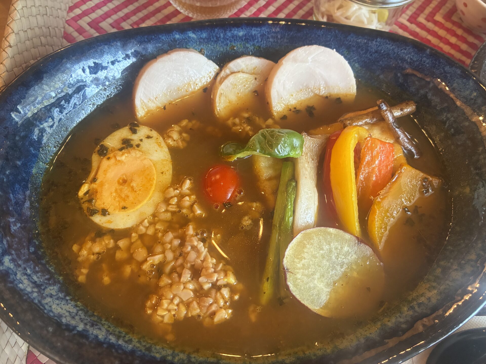 スープカレーには手作りのサラダチキン、ゆで卵、左下がたっぷりの納豆!納豆のインパクトにも増して焼き野菜の種類の多さにびっくりしました。なんと焼き野菜の下には焼き厚揚げが!!びっくりしましたが意外と合いました。
