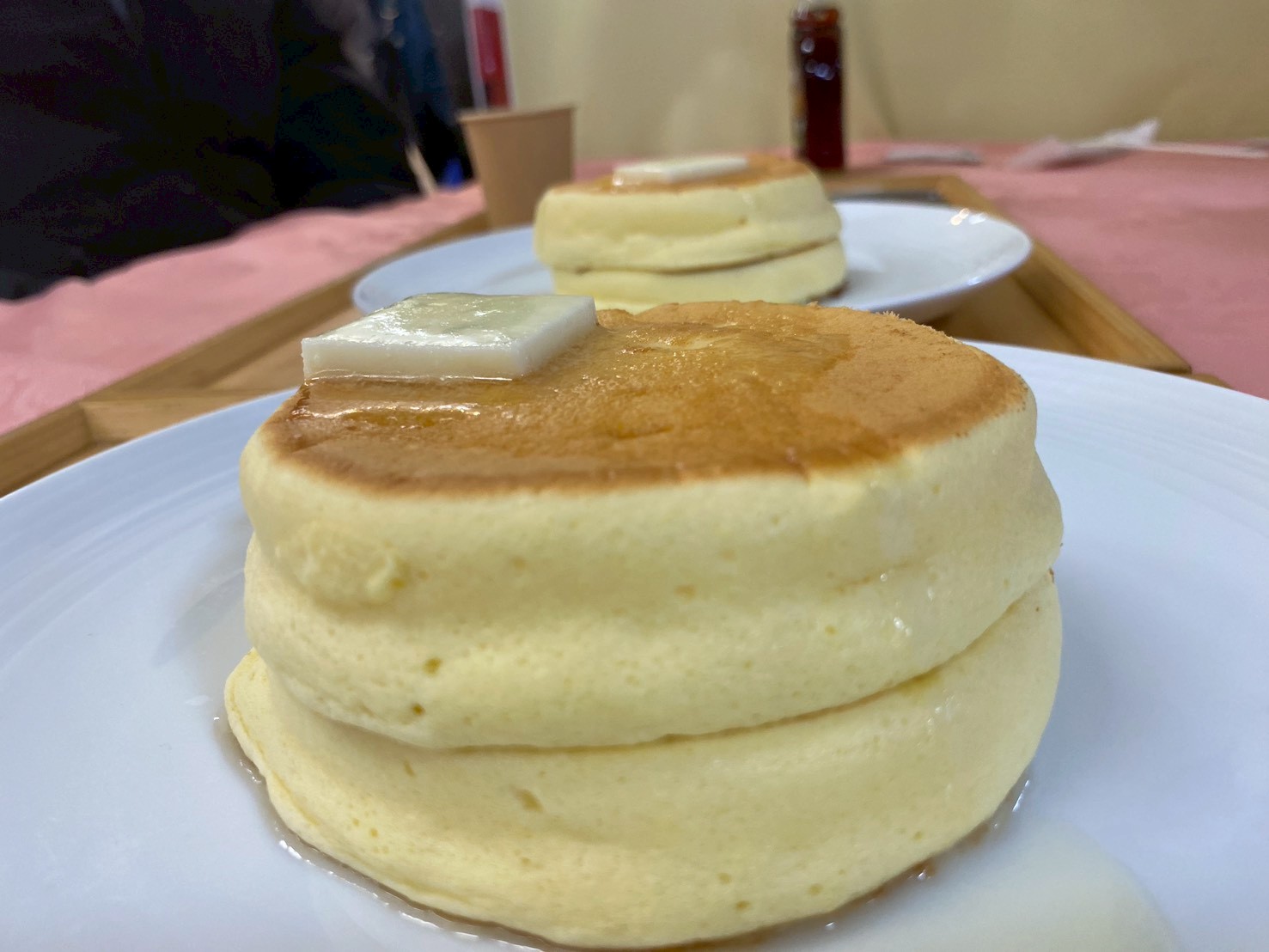 今回の目玉は何といってもこれ!牧場自慢の平飼い卵「天美卵(てんびらん)」をたっぷりと使ったパンケーキです。ベーキングパウダーなどの膨張剤は一切不使用。卵の力だけでふわふわに膨らませているそうです。その繊細さゆえ、賞味期限はなんと「10分」!できたてすぐを味わうのが鉄則です。