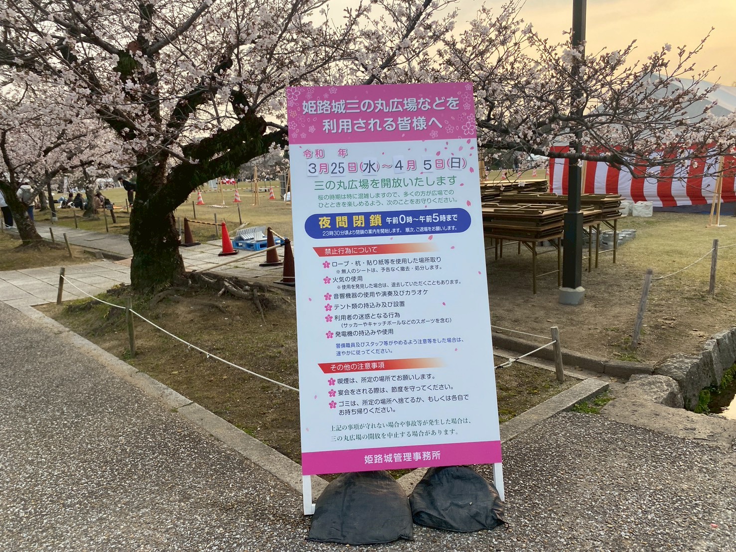 姫路城公式HPによると、2026年は3月25日(水)から4月5日(日)の12日間、三の丸広場(芝生エリア)が開放されます。ソメイヨシノが姫路城の白壁に映える景色は、「日本の桜の名所 100選」にもなっていることから、例年混雑が発生しています。ということで、禁止行為等↓