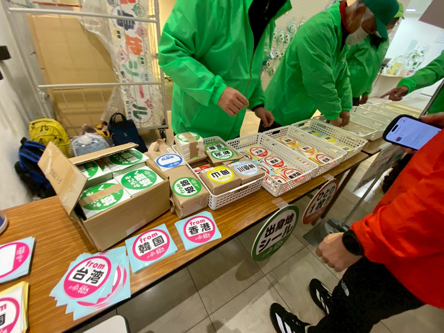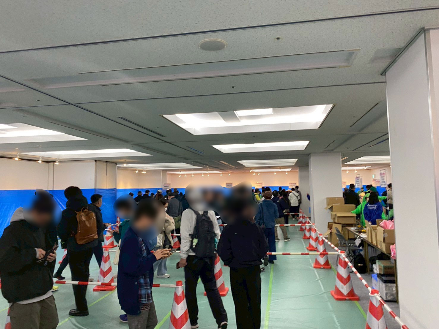 ここでゼッケンをもらいます。みんなワクワクした顔しとるな〜!参加賞のTシャツとかもここでゲット!
