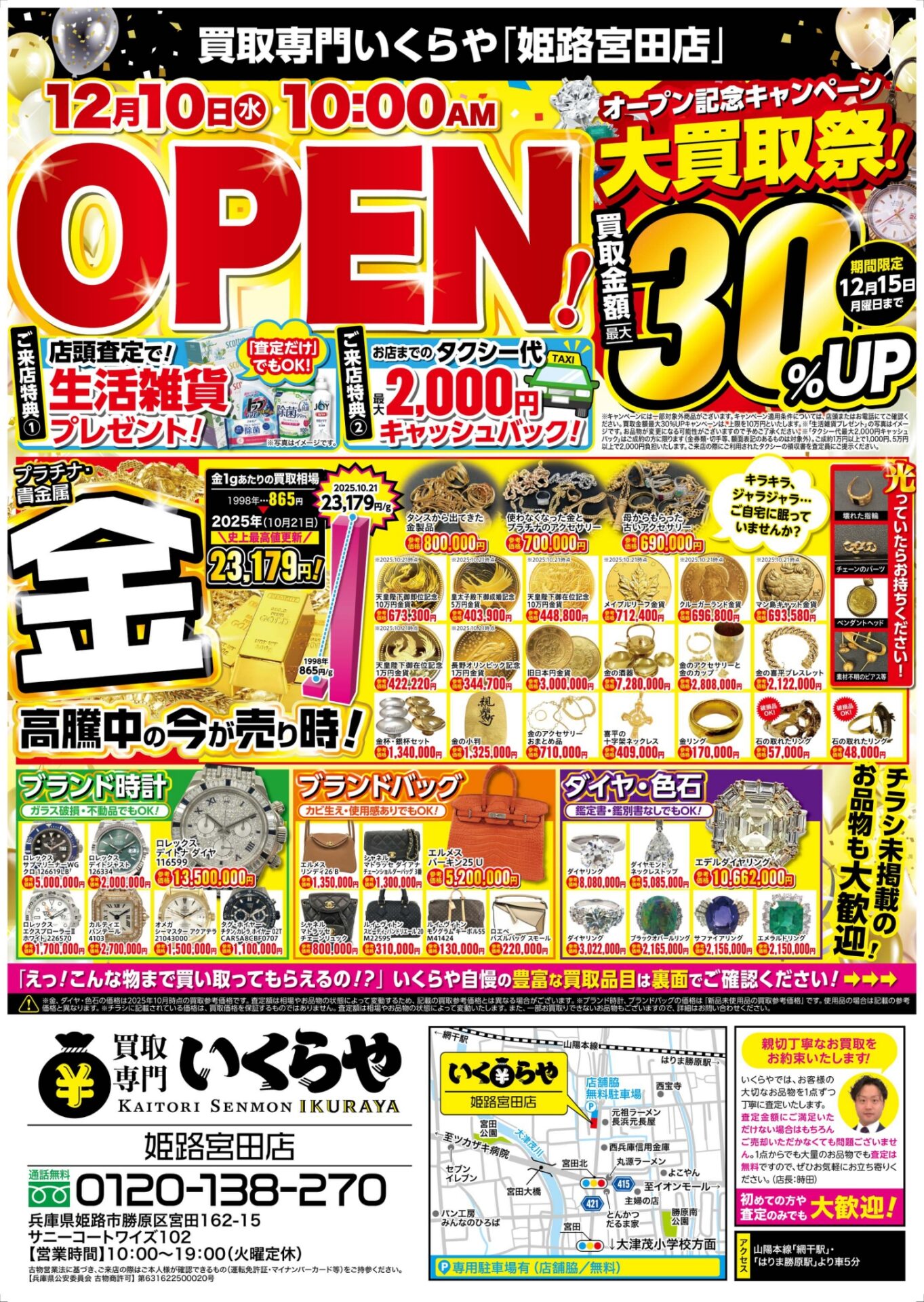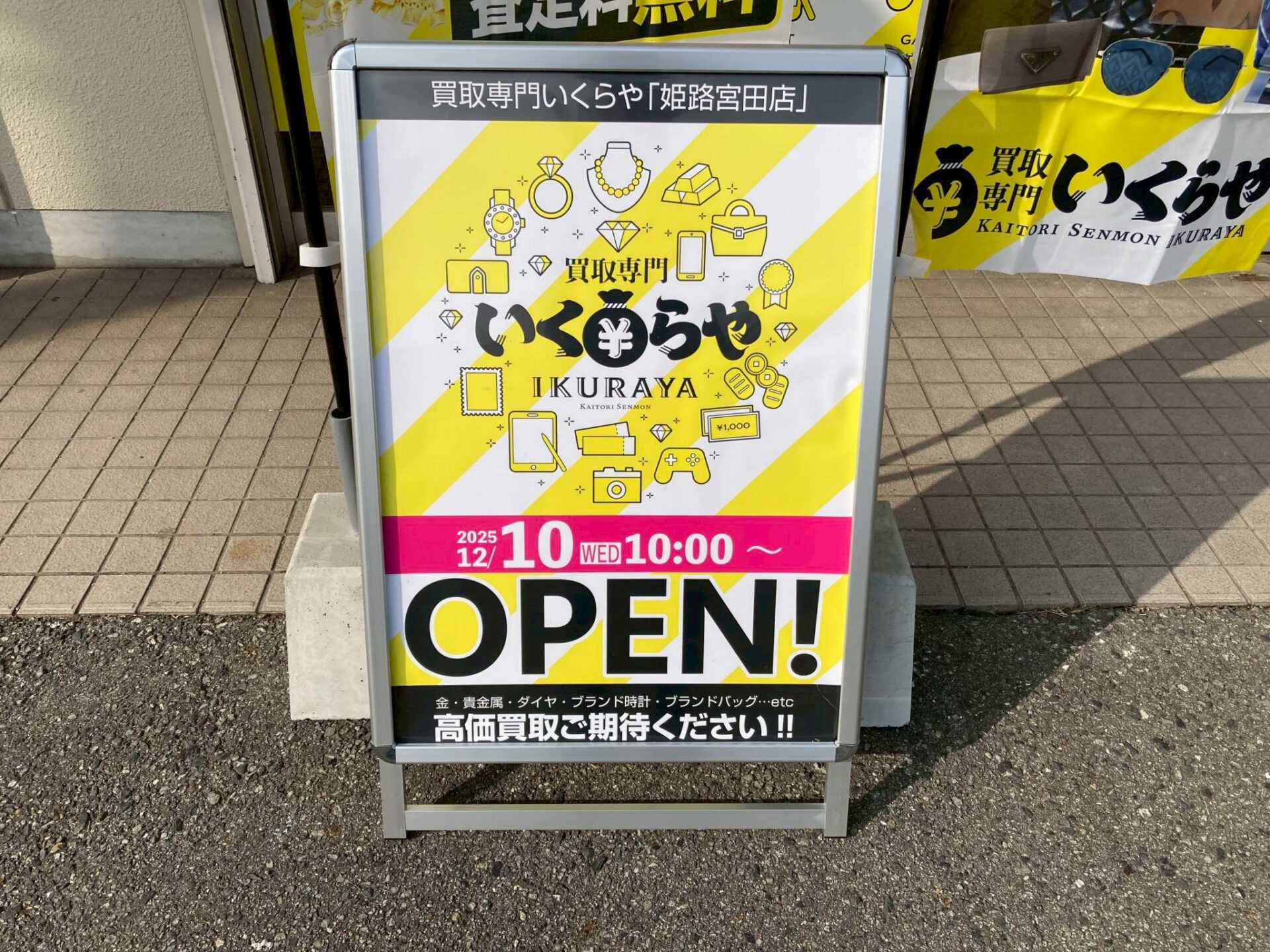 『買取専門いくらや 姫路宮田店』が、2025年12月10日にオープンします。場所は勝原区宮田の陸橋の南、ラーメン元長屋の向かい側。