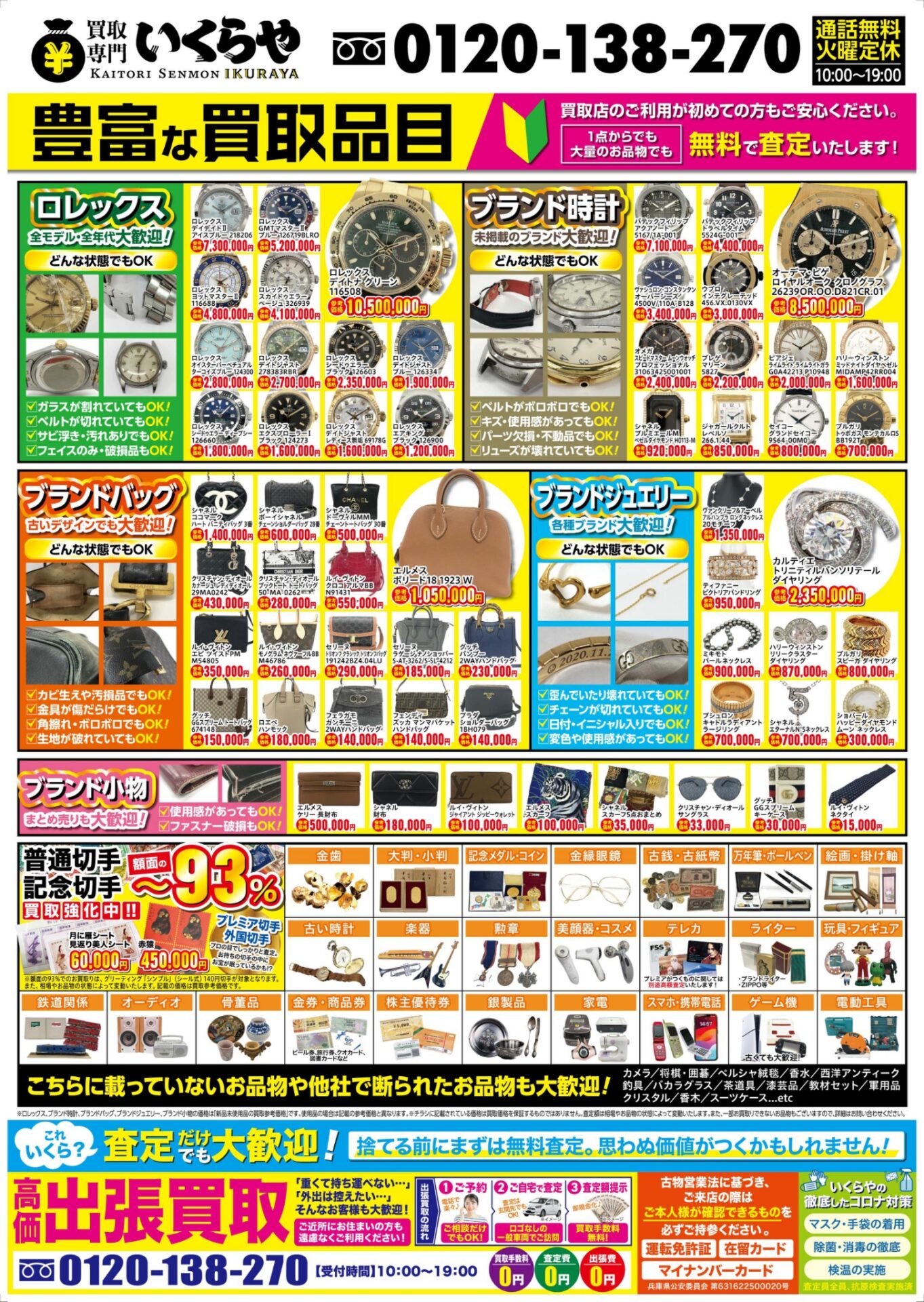金・貴金属・ブランド品・時計の買取を特に強化。そのほかにも、アクセサリー・切手・テレカ・古銭・カメラなど、幅広い品目を取り扱っているそうです。