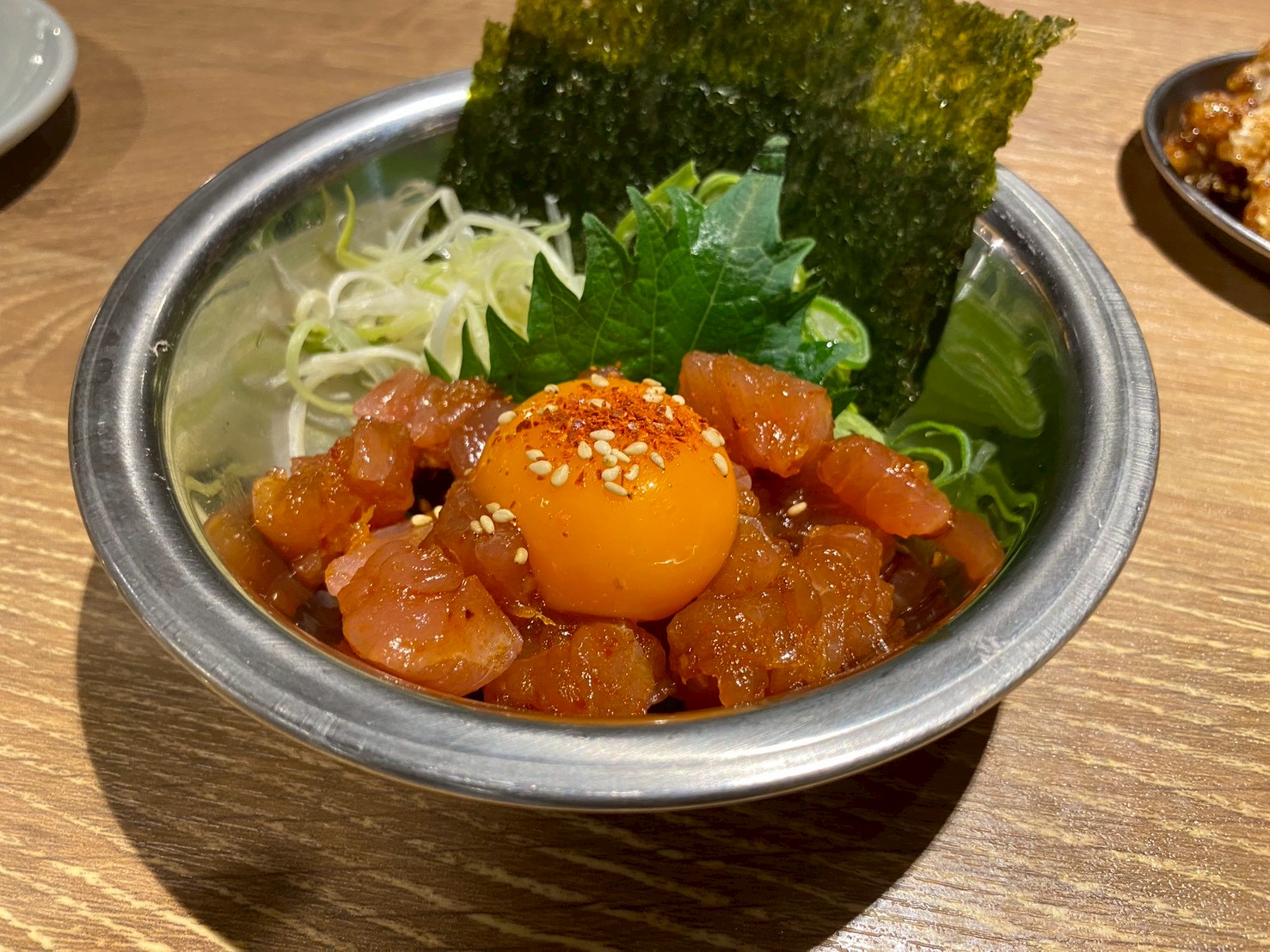 赤身のマグロと旨辛なたれが絡まった旨辛マグロユッケ。
