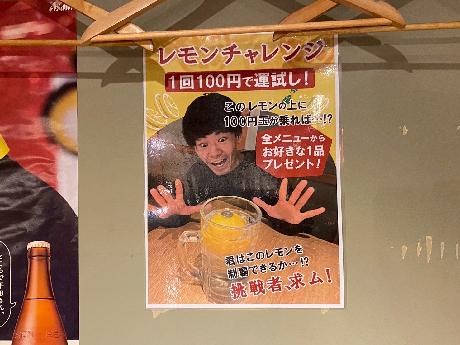 ジョッキに浮いたレモンの上に100円玉を乗せられたら、なんと全メニューからお好きな一品プレゼント!