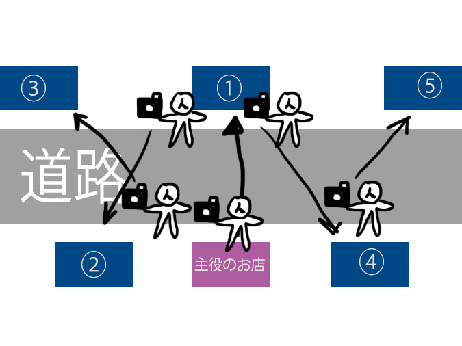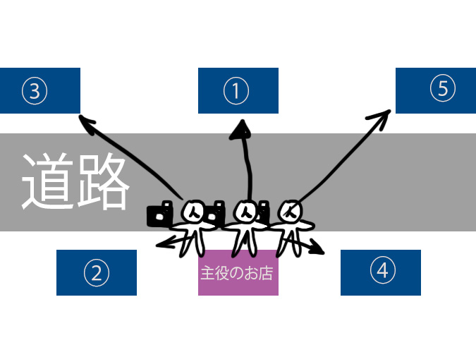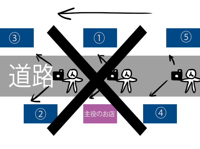- タイトルのお店から見た視点で順番に目標をとっていく(北 1→2→3→4→5 南 1→2→3→4→5)*同じ視点を心がける