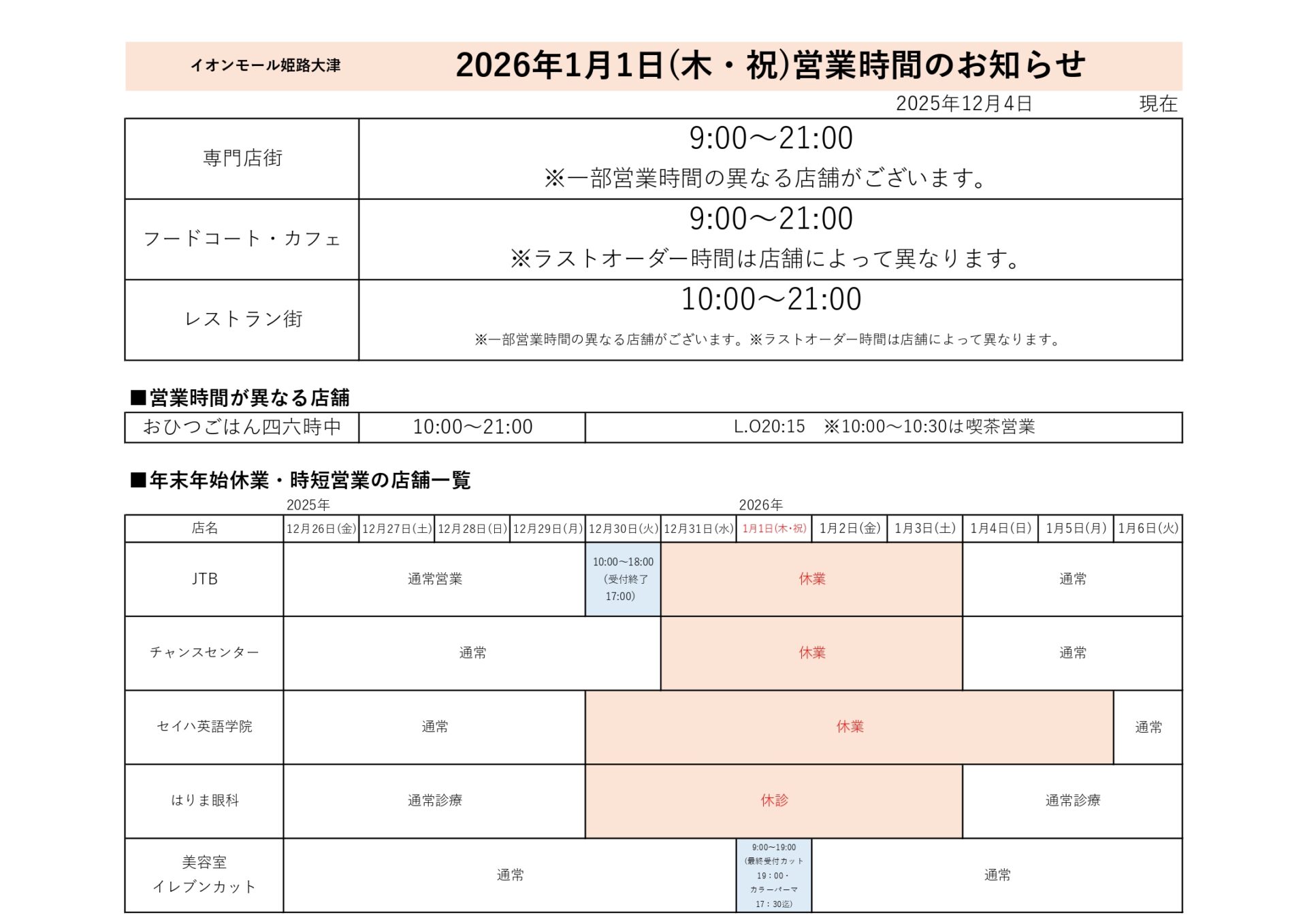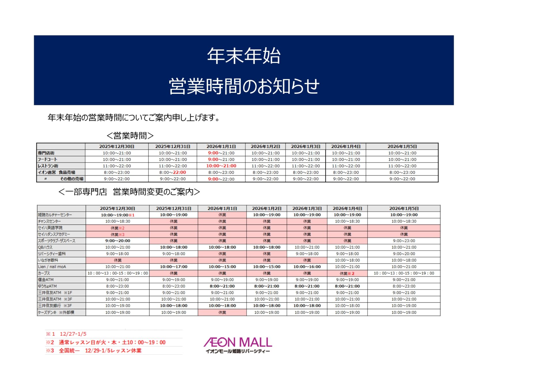 イオンモール姫路リバーシティー専門店、年末年始の営業時間を下記の通り変更させていただきます。