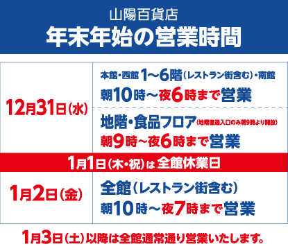詳細は、年末年始営業一覧をご確認くださいませ。