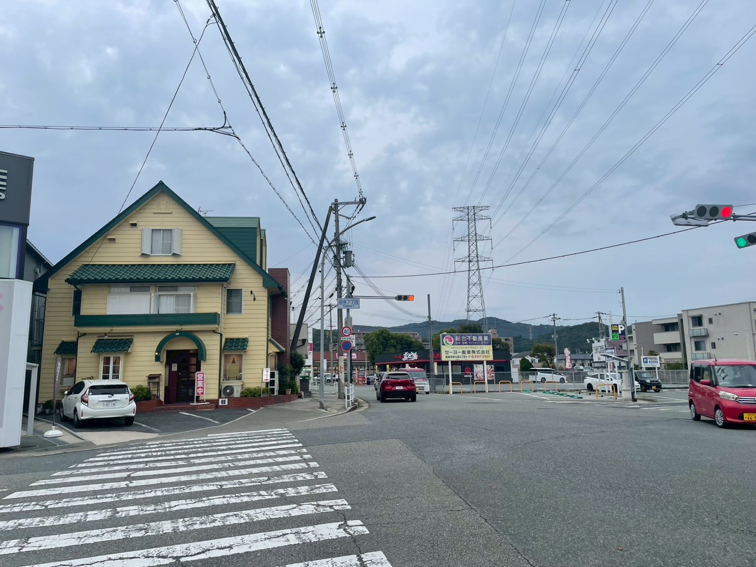 横断歩道の向こうに れかん(喫茶店)。ラー麺ずんどう屋姫路安室店、マックスバリュ安室店が見えます。