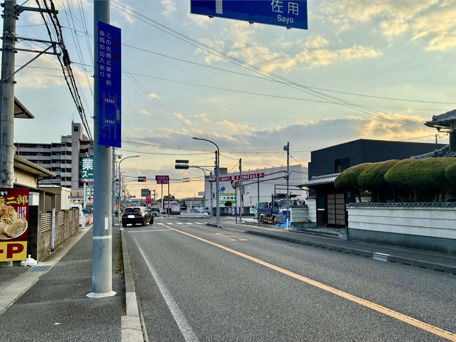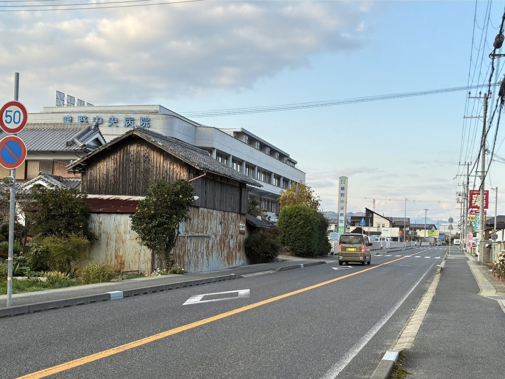 斜め向かいには龍野中央病院。ずっと向こうにはゴダイドラッグ龍野北店の看板が見えます。觜崎橋東詰の信号に続く道です。