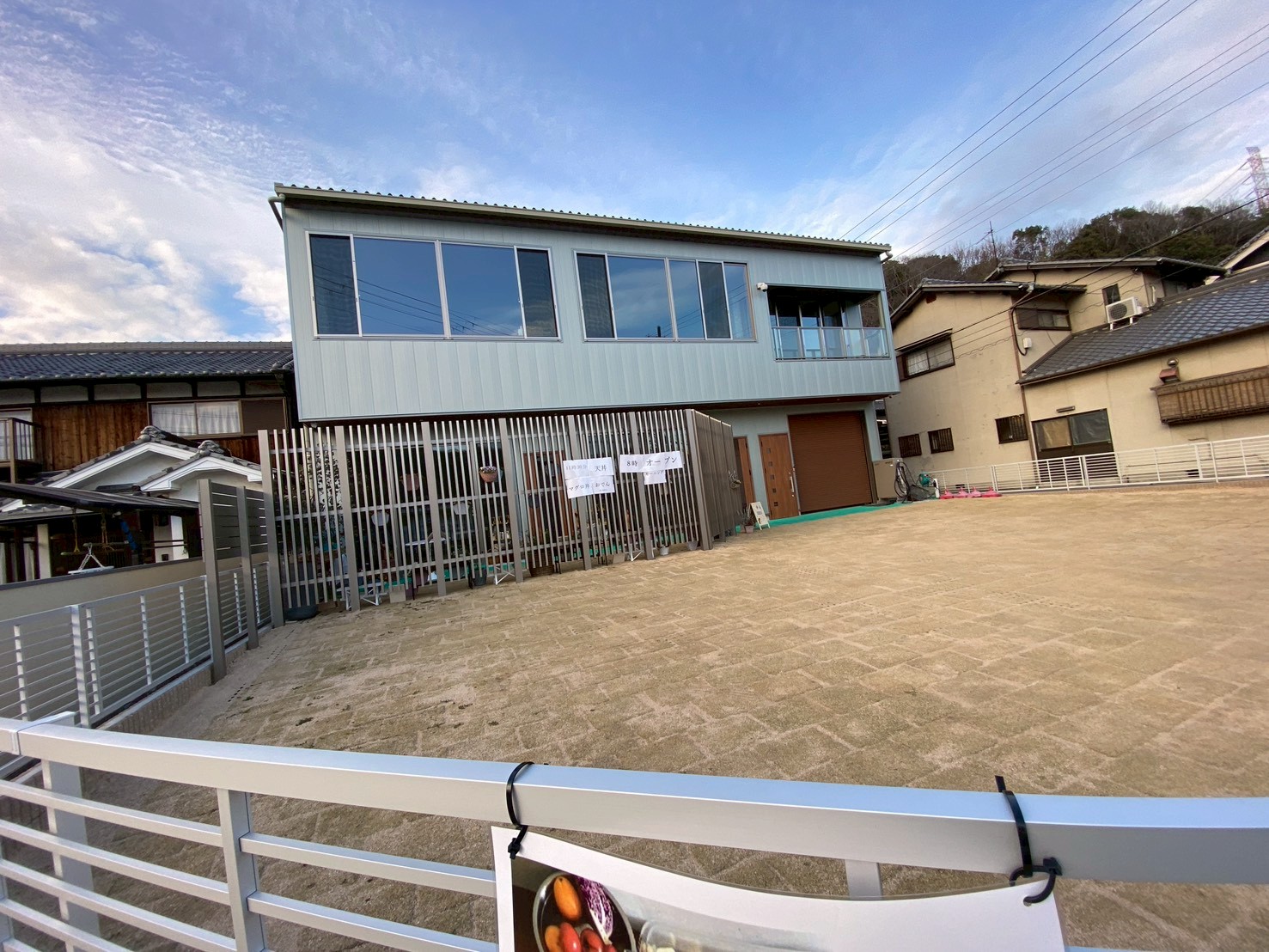 姫路市北原のアイベステクノ(株)の横の建物に、モーニングやまぐろ丼などの文字がありました!看板が出ていないのでお店の名前などはわかりませんが、営業中の旗もあるので食事ができるお店ではないかと思います。