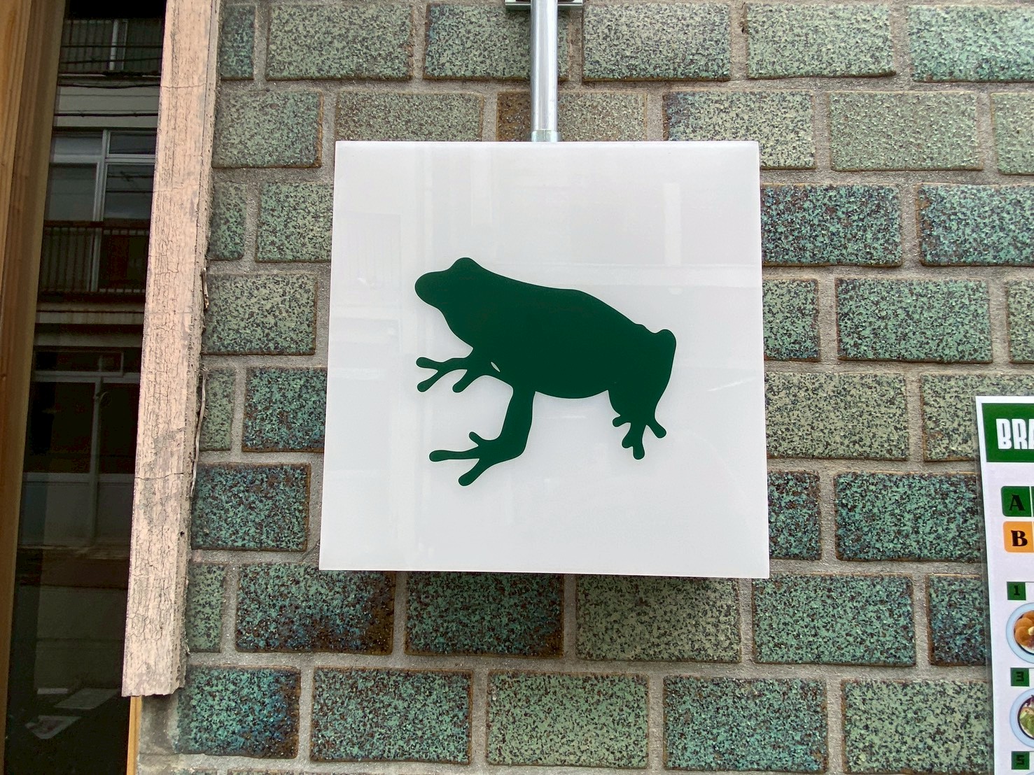 その横には、白地に緑のシルエットが可愛いカエルのロゴマークが掲げられています。