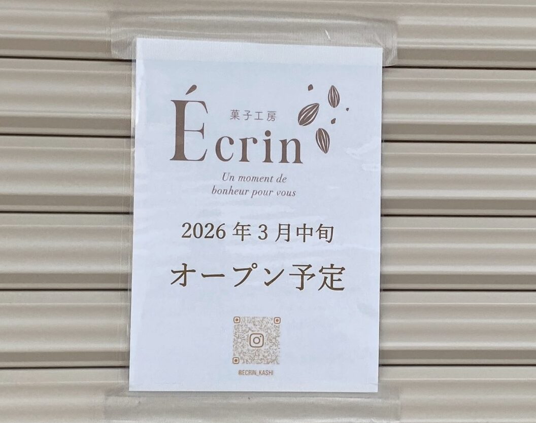 『菓子工房 Ecrin』2026年3月中旬オープン予定と書かれた張り紙が掲示されていました。