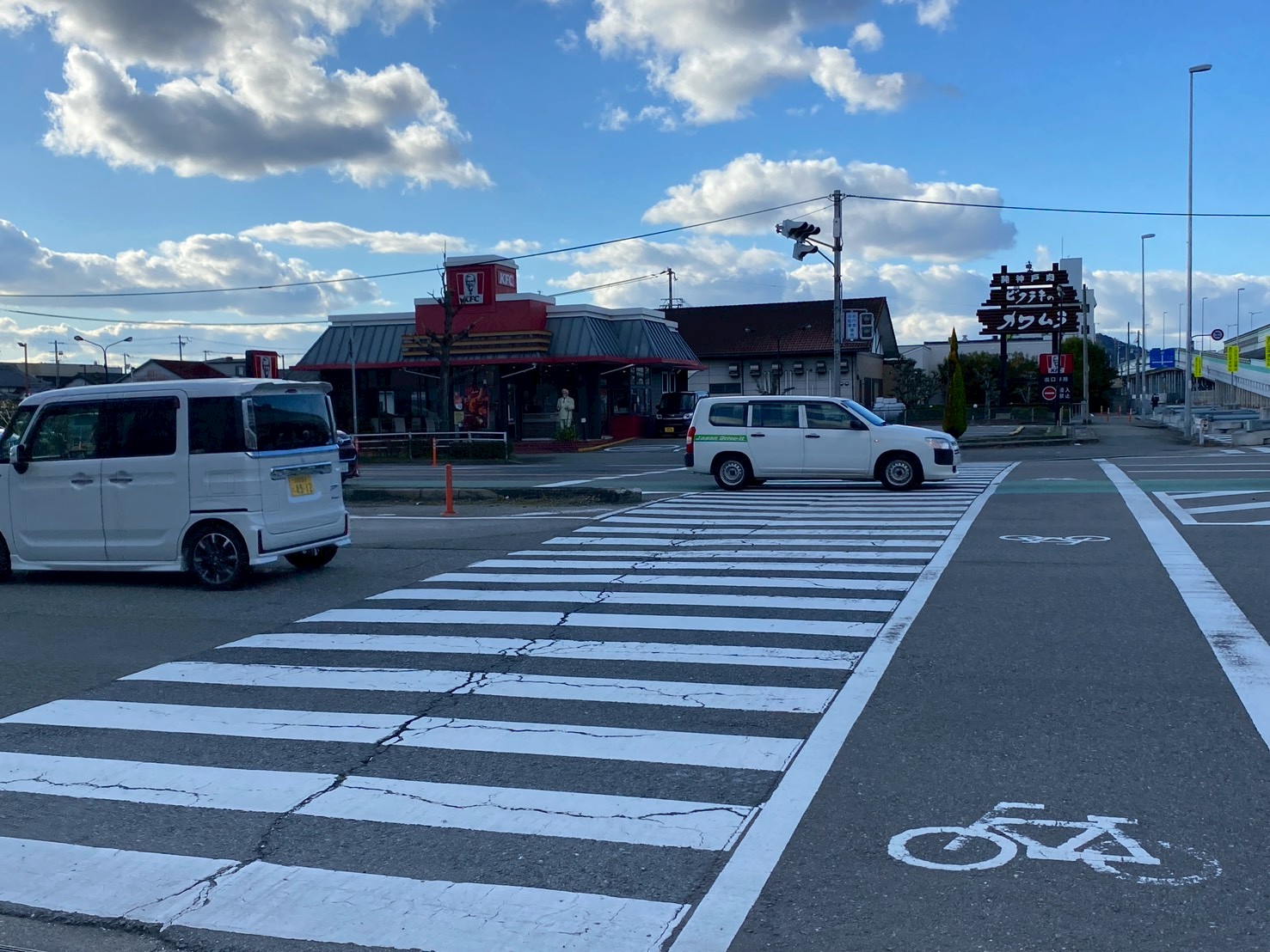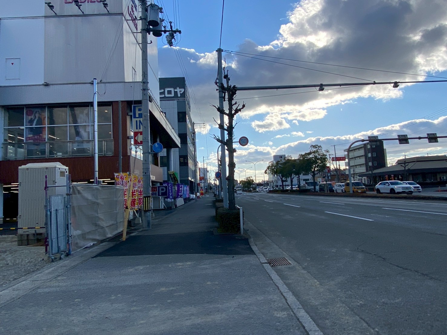駅南大路沿いで交通量も多く、周辺には衣料品店や飲食店も充実しているエリア。車で訪れやすい立地。….いや、角なんで入りにくい!?