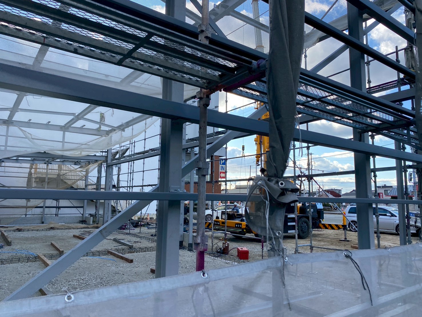 鉄骨も組まれ始めていて、建物の形が少しずつ見えてきています。
