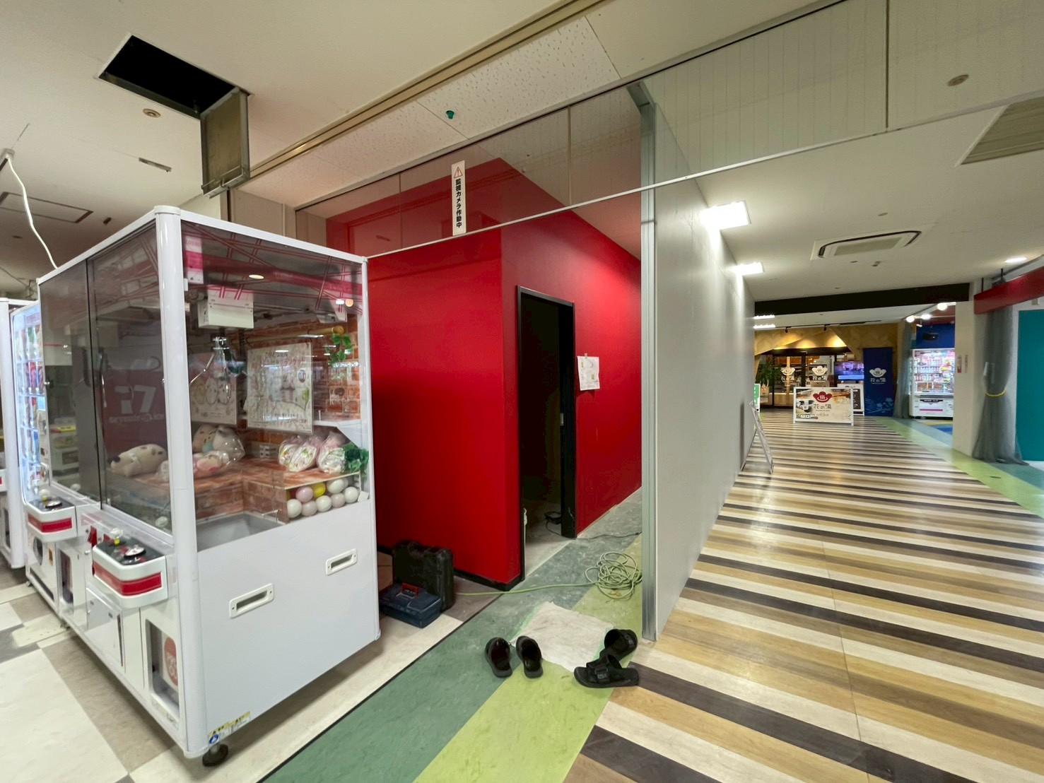 赤い壁、カラオケの個室っぽいのが作られてる。