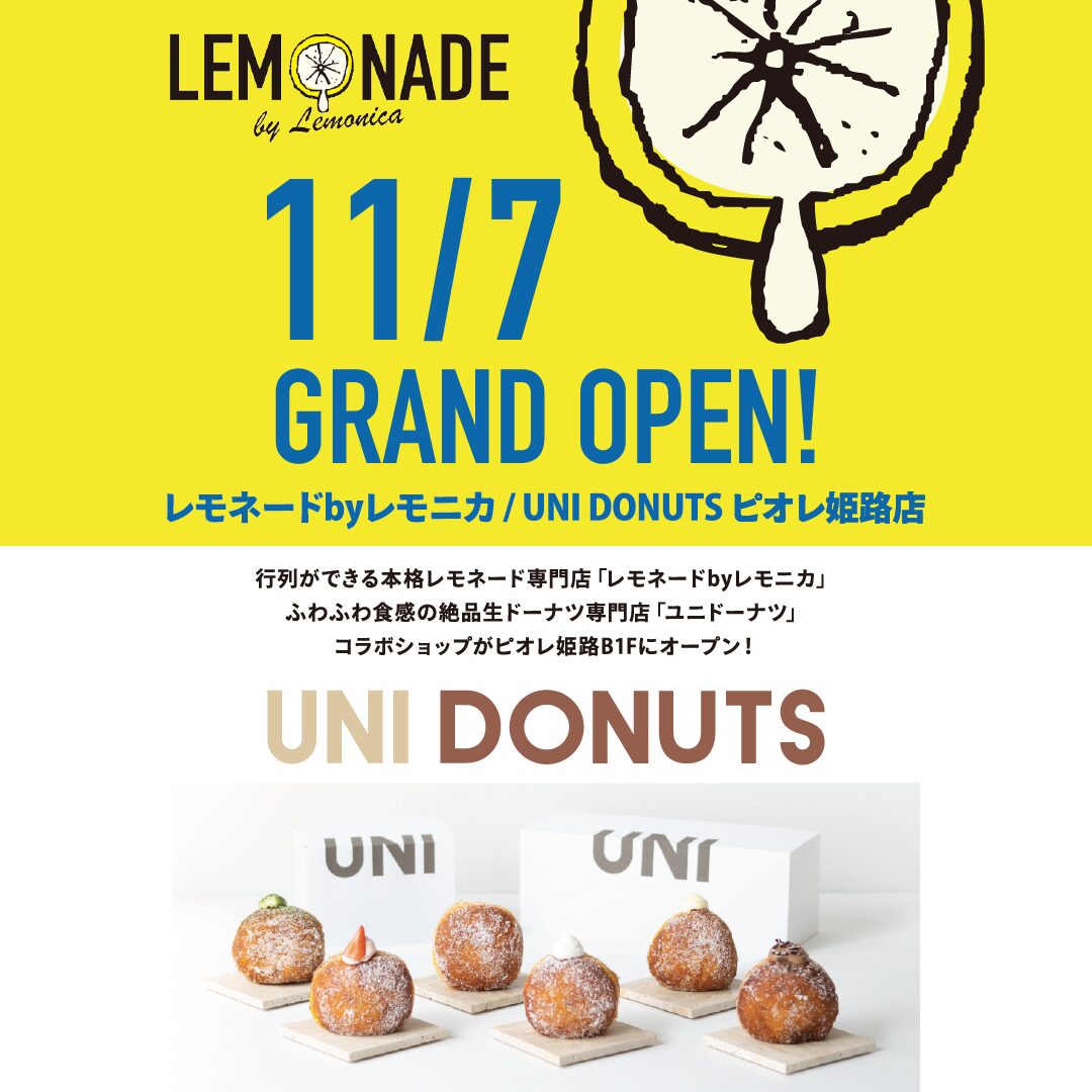 ピオレ姫路公式HPに、「レモネードbyレモニカ」 と「ユニドーナツ」のコラボショップがオープンといったお知らせがありました。11月7日オープン予定とのこと。