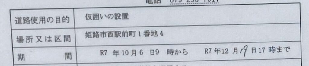 工事現場に掲示されている道路使用許可申請書によると、道路使用期間は令和7年(2025年)10月6日9時から12月19日17時までとのこと。