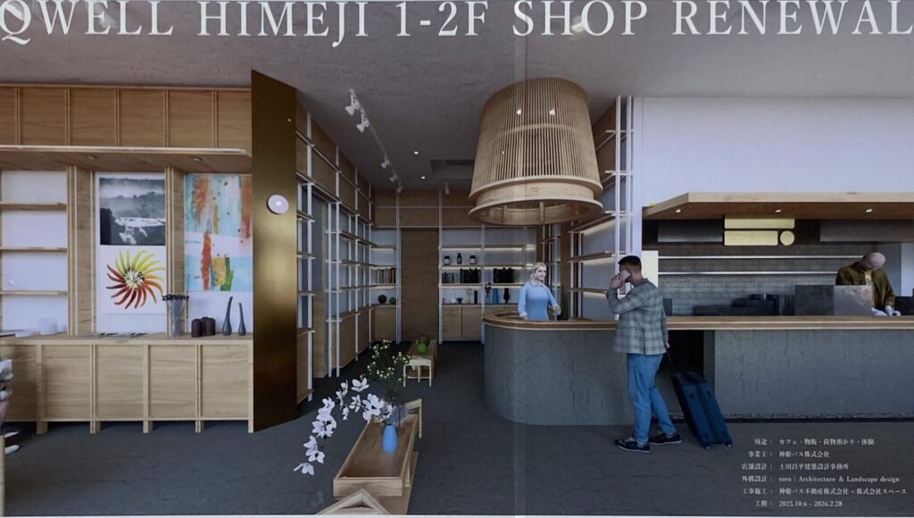 完成予想図を見ると、木製のカウンターや温かみのあるインテリア、大型のペンダントライトなどが配置された、モダンでおしゃれな空間でカフェ・物販・荷物預かり・体験ができる複合施設になるみたいです。
