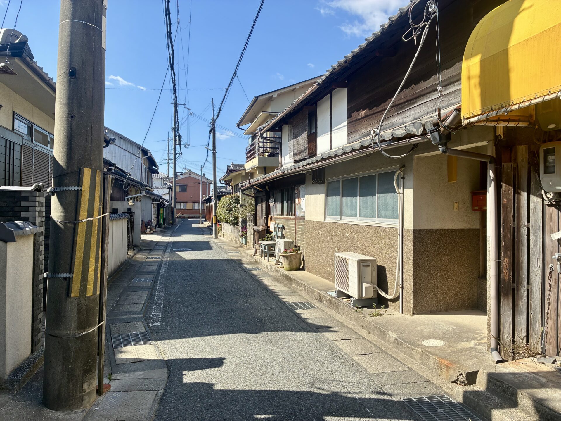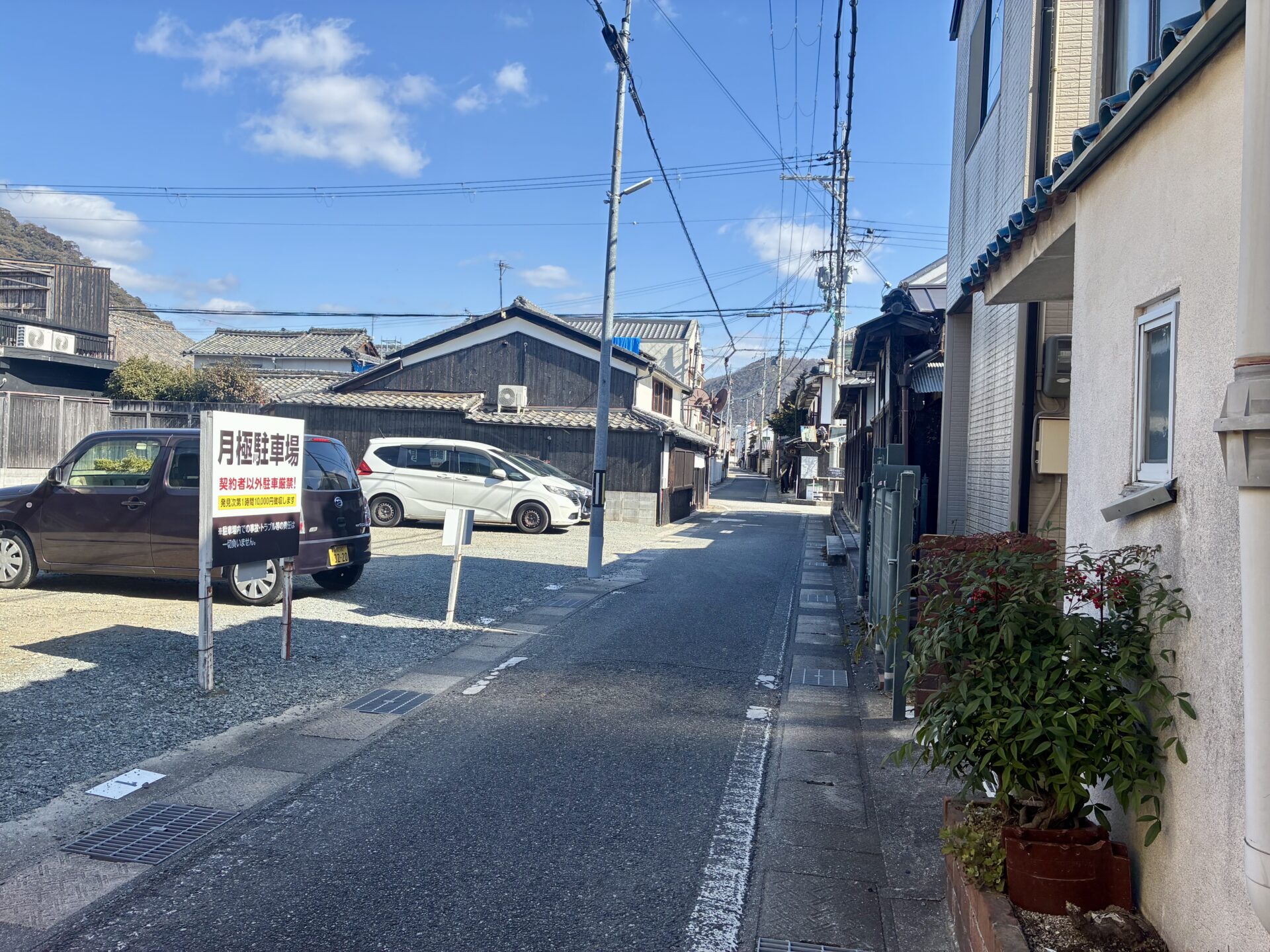 目の前は月極駐車場、その向こうに城下町古民家ホテルkurasu。交差点の向こうには勝楽や和創酒楽屋 燈があります。