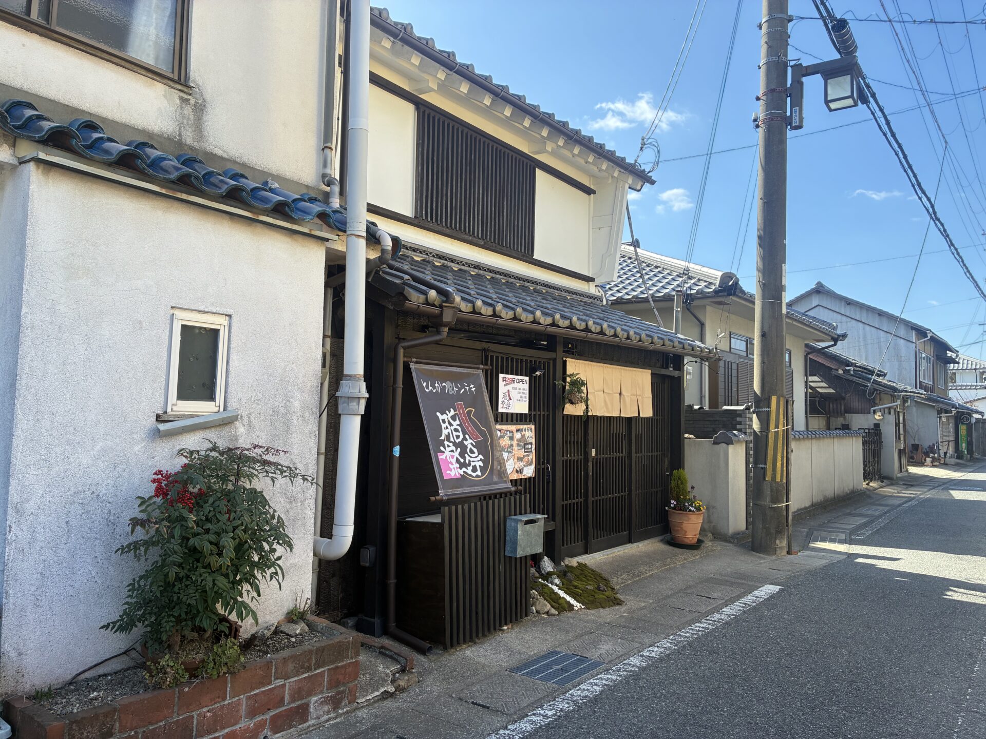 龍野城下町に1月29日にとんかつとトンテキのお店『脂楽亭(しらくてい)』がオープンしています。古民家をリノベーションしたお店で黒い格子戸や、白壁から城下町らしさが感じられる外観でした。店内は厨房を囲むようにカウンター席があり、奥には靴を脱いで入るテーブル席があります。